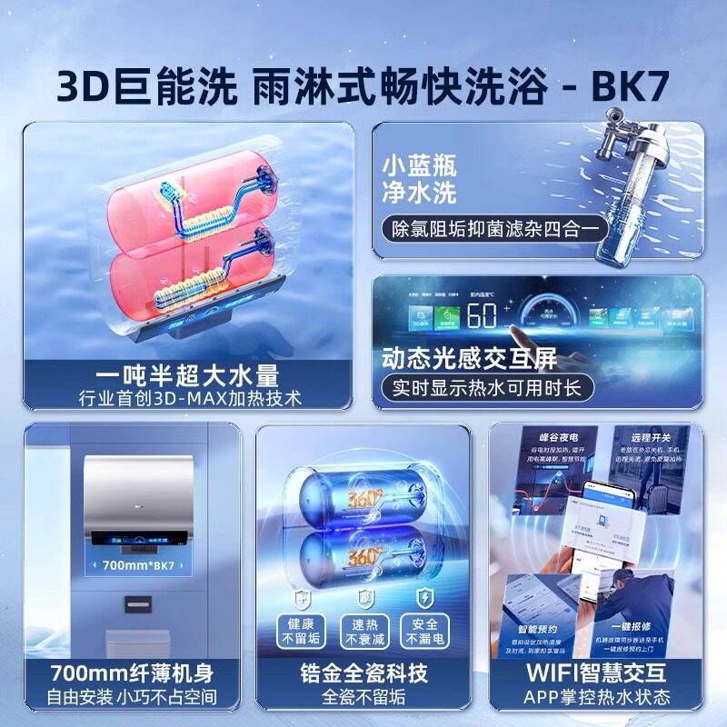 海尔电热水器BK5(小蓝瓶系列)是一款专为家庭洗澡设计的60L扁桶双胆电热水器,搭载3D速热技术,加热更高效,大幅缩短等待时间。采用双胆分层加热设计,智能匹配用水需求,节能省电,达到国家一级能效标准。机身纤薄美观,节省安装空间,适合多种户型。配备多重安全保护系统,包括防电墙、防干烧、防超压等,使用更安心。智能操控便捷,支持预约加热和温度调节,满足不同家庭成员的洗浴习惯。海尔BK5兼顾高效、节能与安全,是现代家庭舒适洗浴的理想之选。