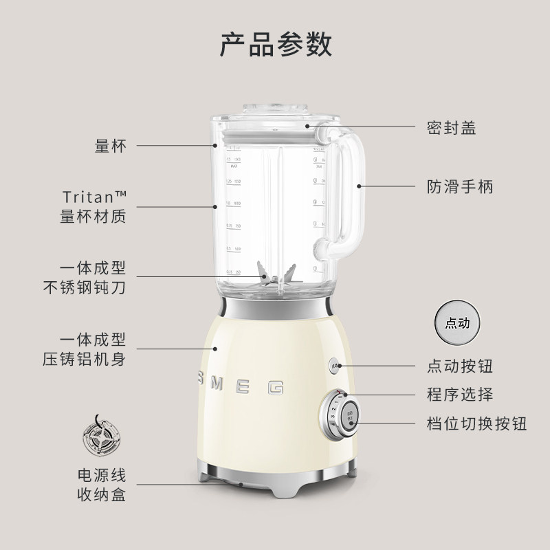 SMEG(斯麦格)BLF03复古家用多功能料理机,融合经典意式美学与现代科技,以优雅的复古造型成为厨房焦点。这款破壁搅拌料理机具备多档调速功能,可轻松应对果汁、奶昔、浓汤及婴儿辅食等多种料理需求。强劲电机搭配精钢刀片,高效破壁,细腻无渣,保留食材营养。静音设计兼顾低噪运行,使用更安心。食品级材质安全健康,拆卸清洗便捷。无论是为宝宝制作细腻的辅食,还是为全家准备营养饮品,BLF03都能轻松胜任,兼具实用性与艺术美感,是现代家庭的理想厨房伴侣。