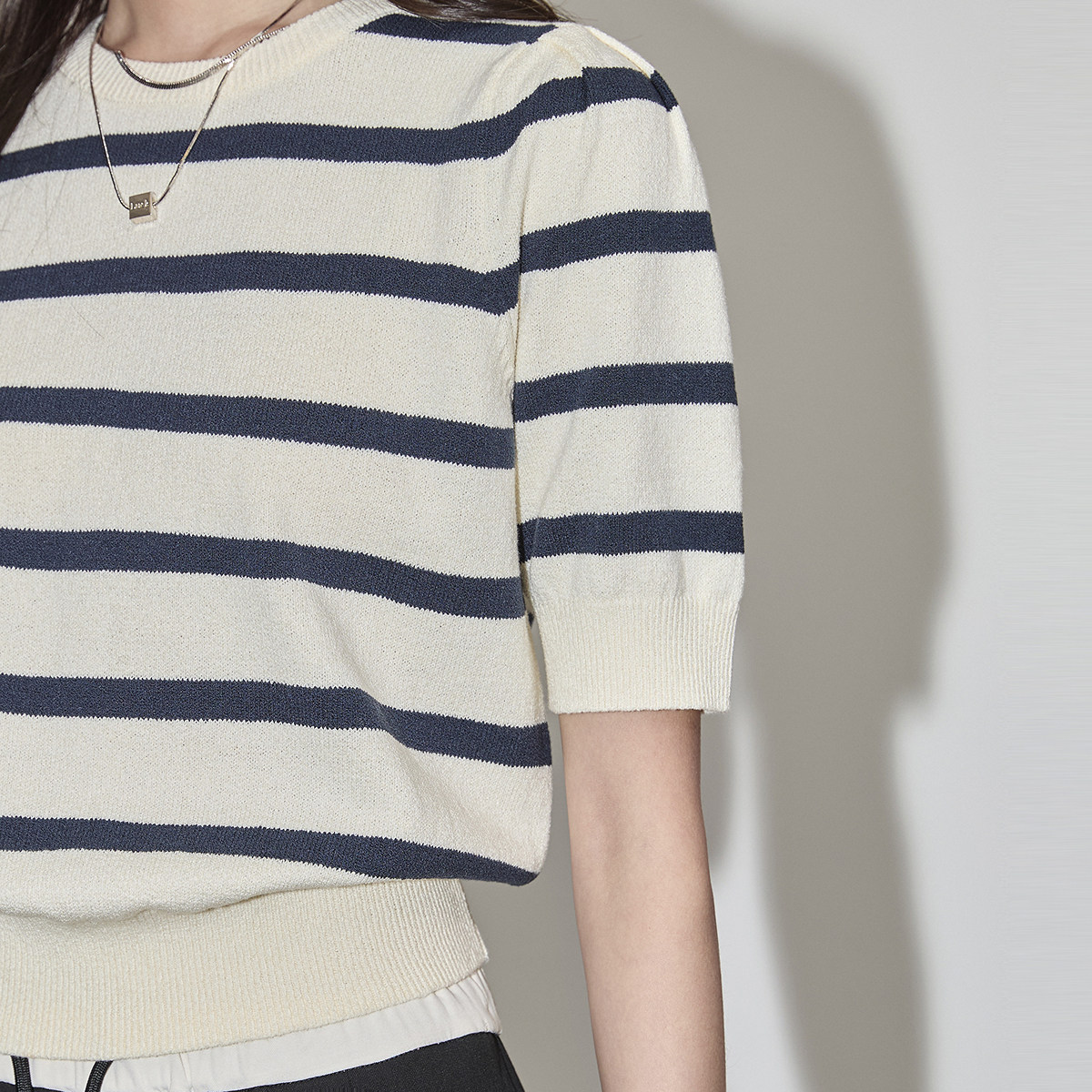 天猫LILY2026夏新款复古条纹休闲通勤气质泡泡袖修身短款针织衫女毛衣