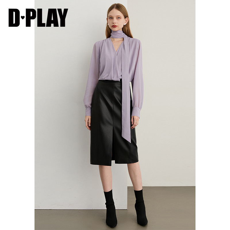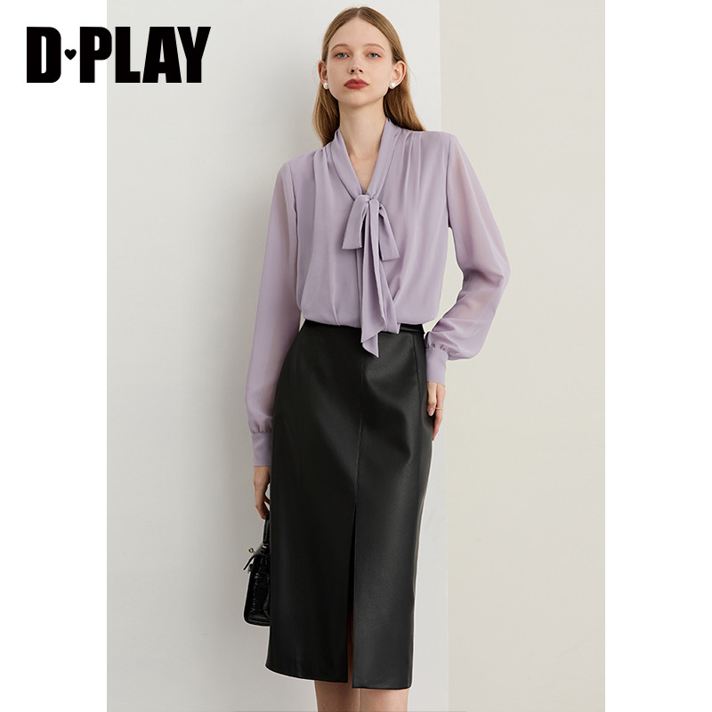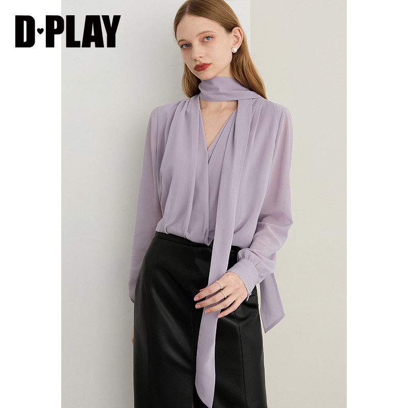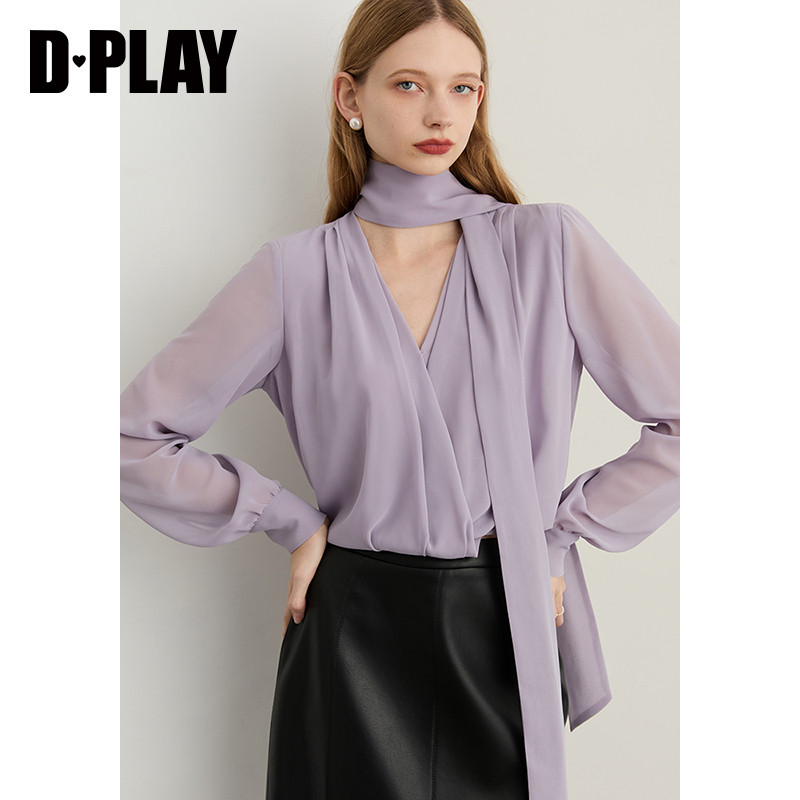天猫DPLAY2026年春季新款紫色衬衫女气质法式飘带设计宽松衬衣上衣
