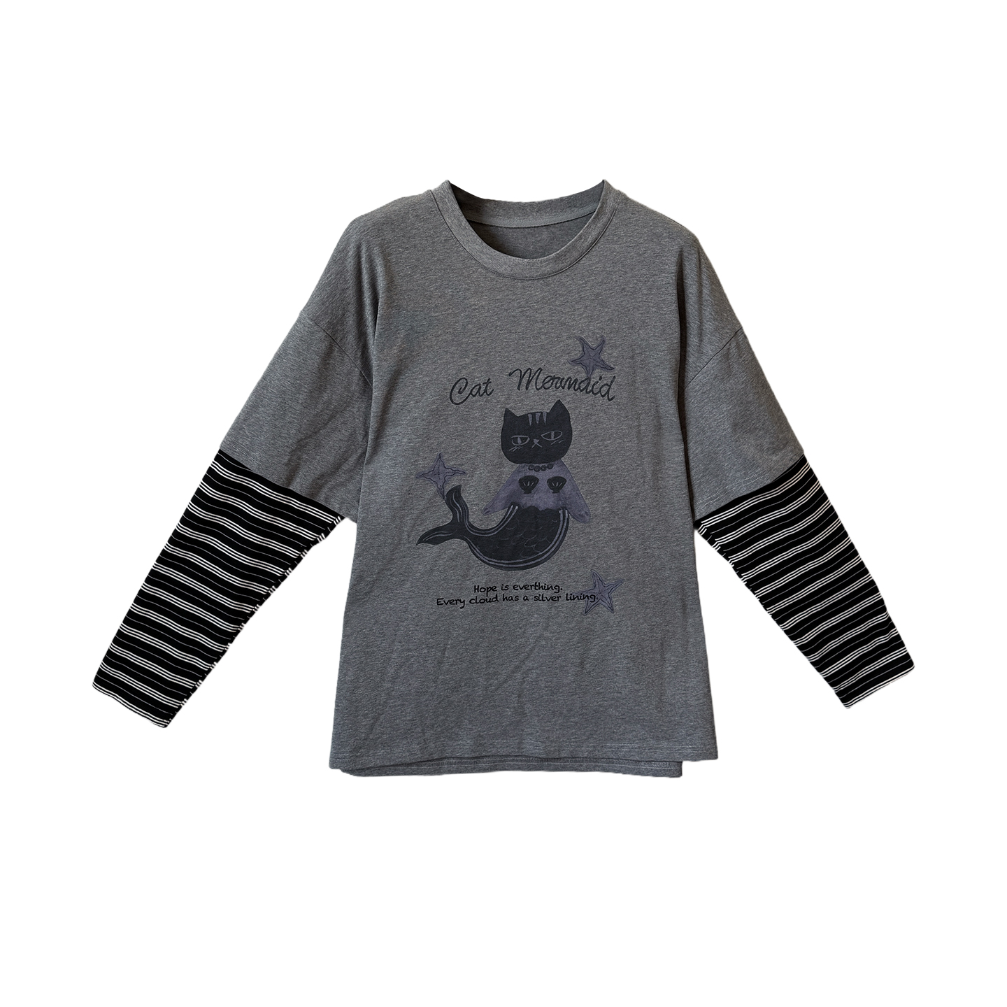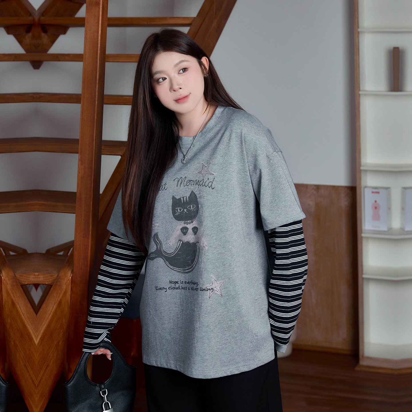 淘宝别致美猫鱼印花长袖大码T恤女2025年秋新款胖mm宽松条纹拼接上衣