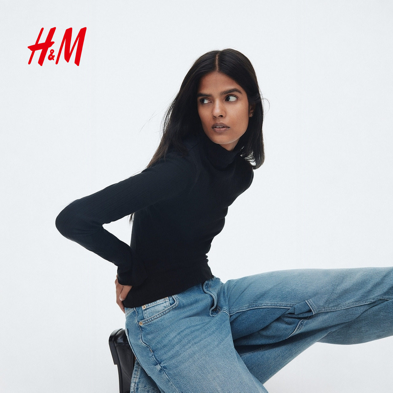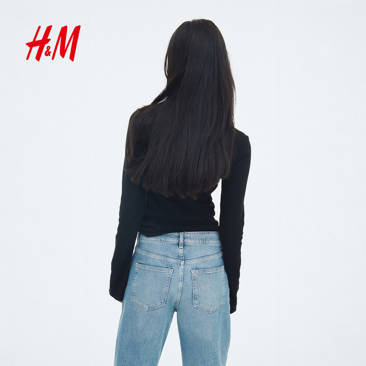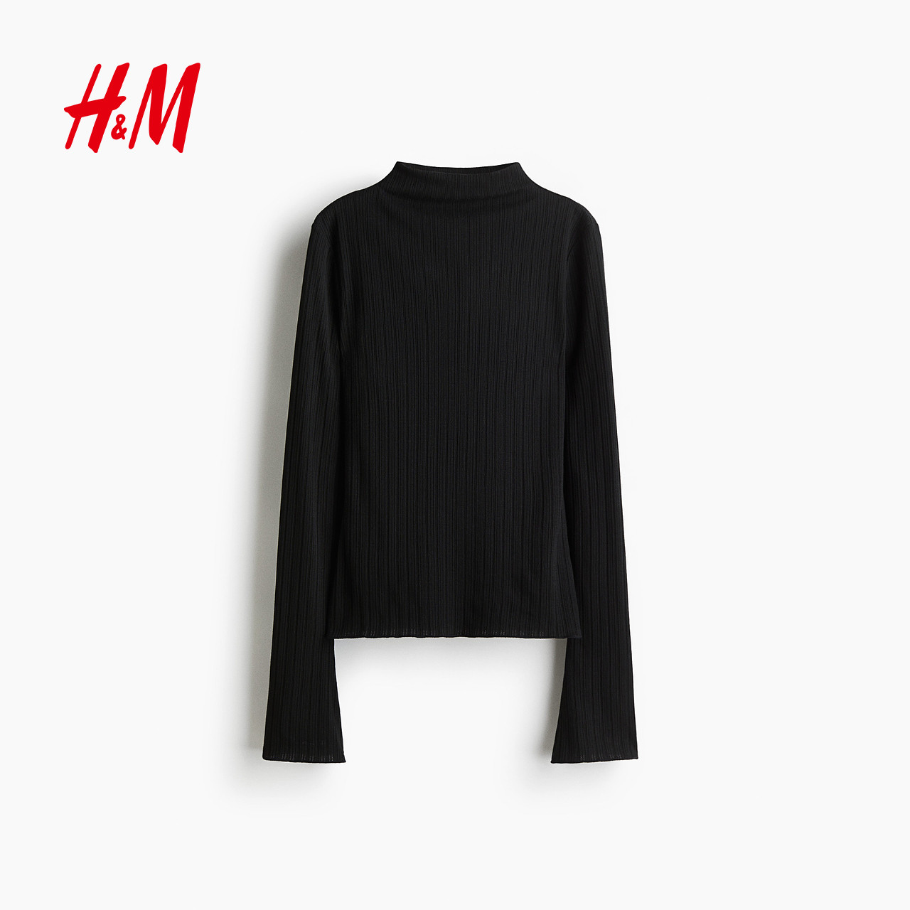 天猫HM女装T恤春季罗纹高领上衣喇叭长袖气质打底衫1296049