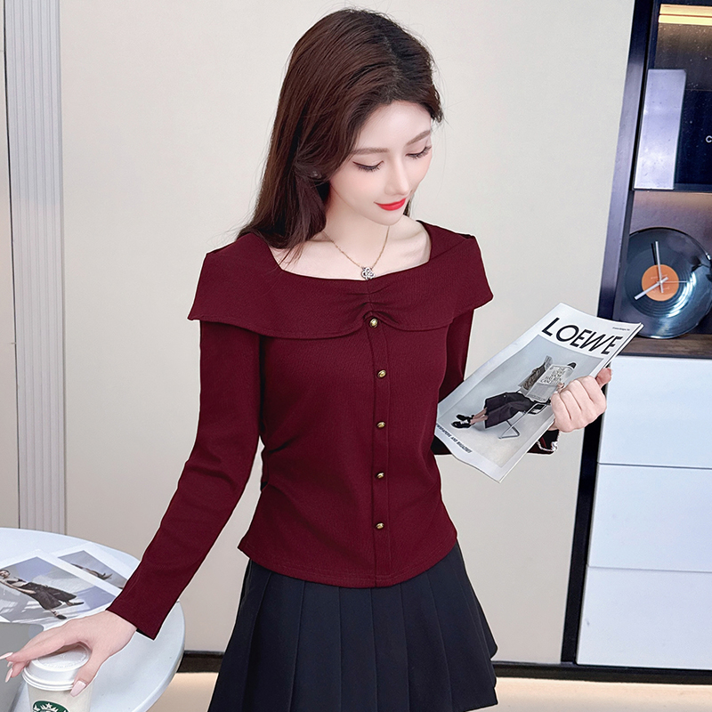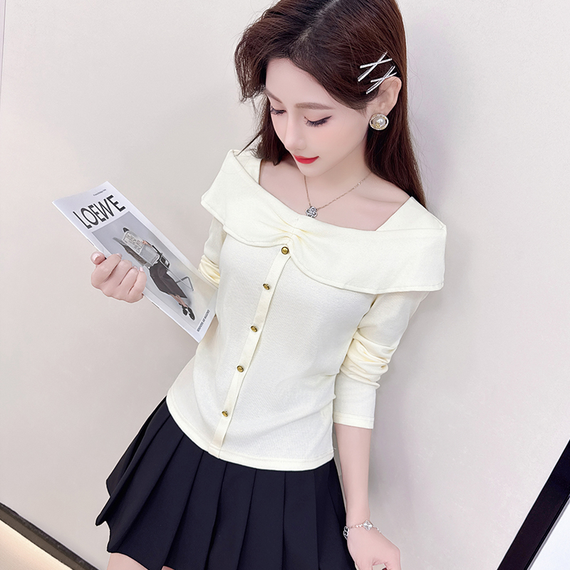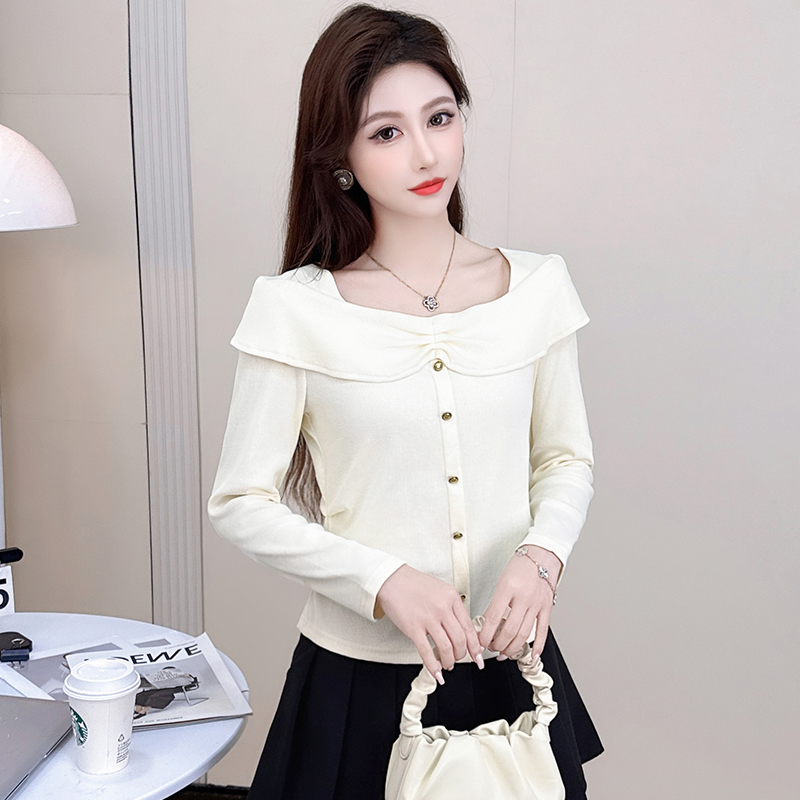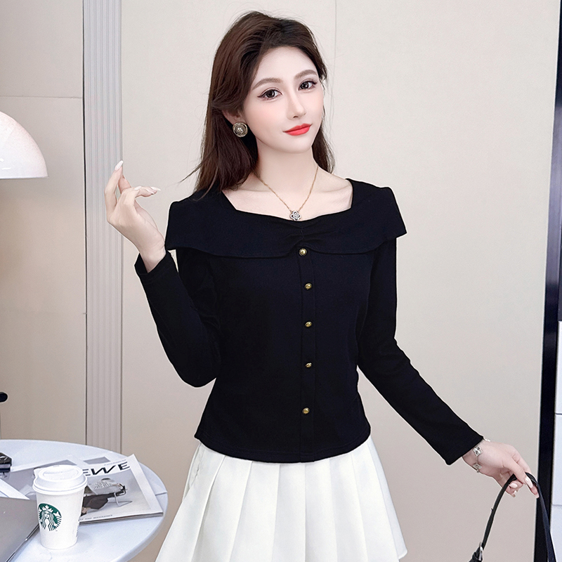 淘宝方领长袖T恤女士春秋新款洋气韩版休闲百搭小个子内搭短款打底衫