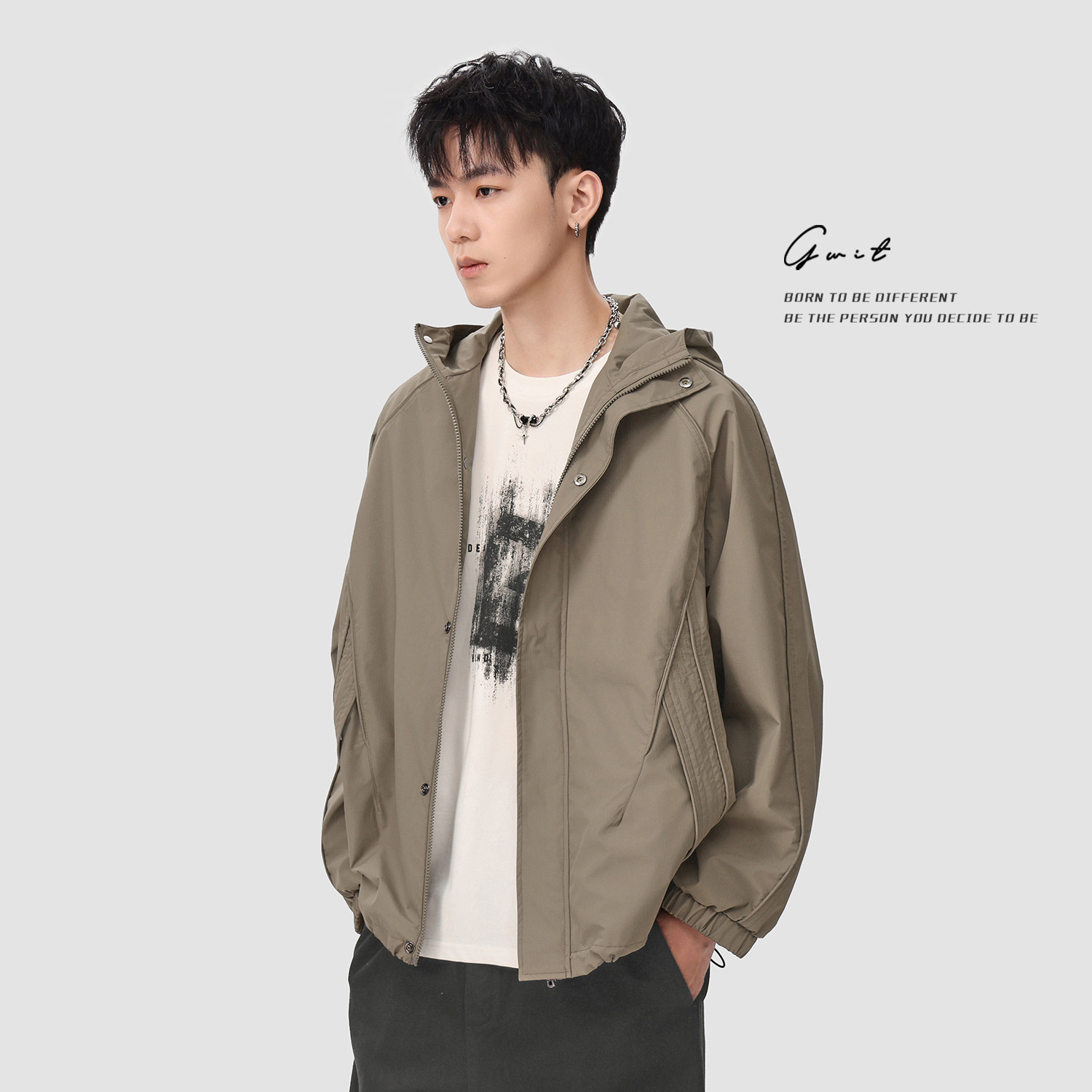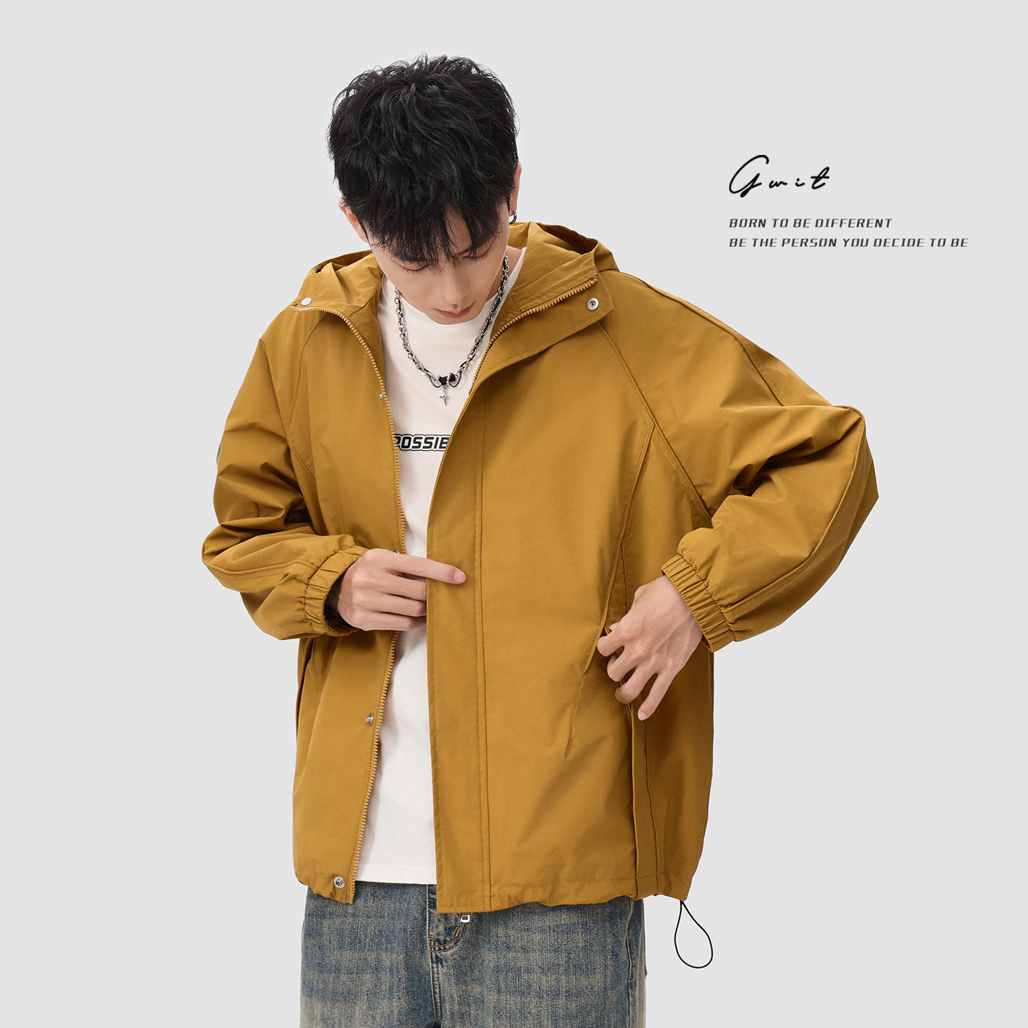 GWIT硬壳户外三防运动夹克,专为男性户外爱好者打造,融合功能性与时尚设计。采用高密度防水透气面料,具备防风、防水、防污三重防护,轻松应对多变山地气候。短款廓形剪裁利落有型,搭配可调节连帽设计,增强活动自由度与防护性。立体剪裁与设计师联名细节,兼顾专业性能与都市潮流感。多口袋布局实用便捷,腋下透气拉链提升排湿效率。无论是高山徒步、露营探险,还是日常通勤,这款夹克都能提供全天候舒适保护,是追求品质与风格并重的户外之选。