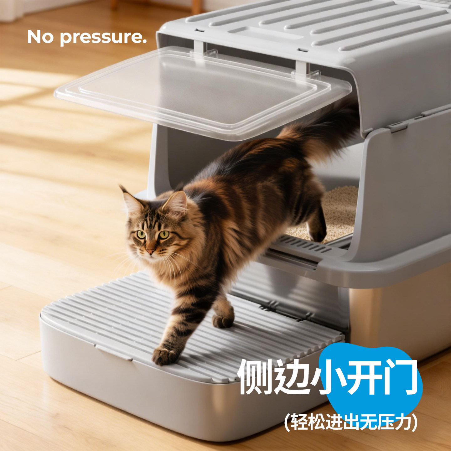 这款不锈钢全封闭式猫砂盆专为大型猫咪如缅因猫设计,采用优质304不锈钢材质,坚固耐用、防锈易清洁,有效延长使用寿命。超大空间配合顶出式入口,方便猫咪进出,同时防止猫砂外溅,保持地面整洁。全封闭结构搭配可拆卸顶盖和内置活性炭过滤层,显著降低异味扩散,提升居家空气质量。底部加深设计有效承接散落猫砂,搭配可拆卸踏板,进一步减少带出。整体结构稳固,拆装便捷,兼顾实用性与美观,是追求高品质养猫体验的理想选择,尤其适合多猫家庭或对卫生要求较高的用户。
