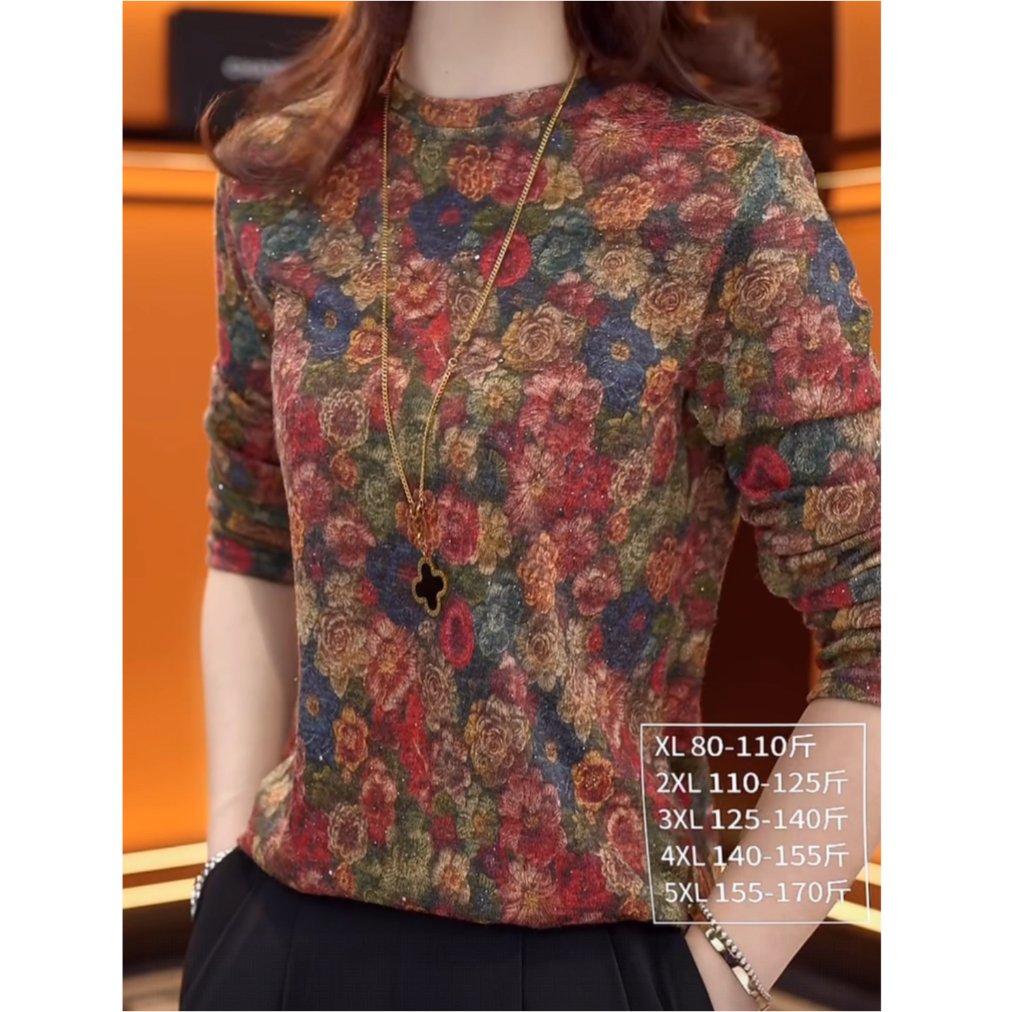 半高领加厚加绒大码女装保暖洋气长袖T恤圆领印花打底休闲上衣ins