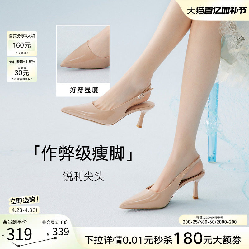 天猫百思图2026夏商场新款气质裸色细跟高跟鞋尖头女后空凉鞋CU712BH6
