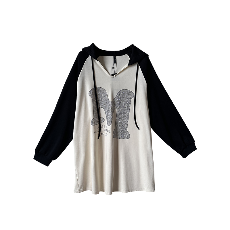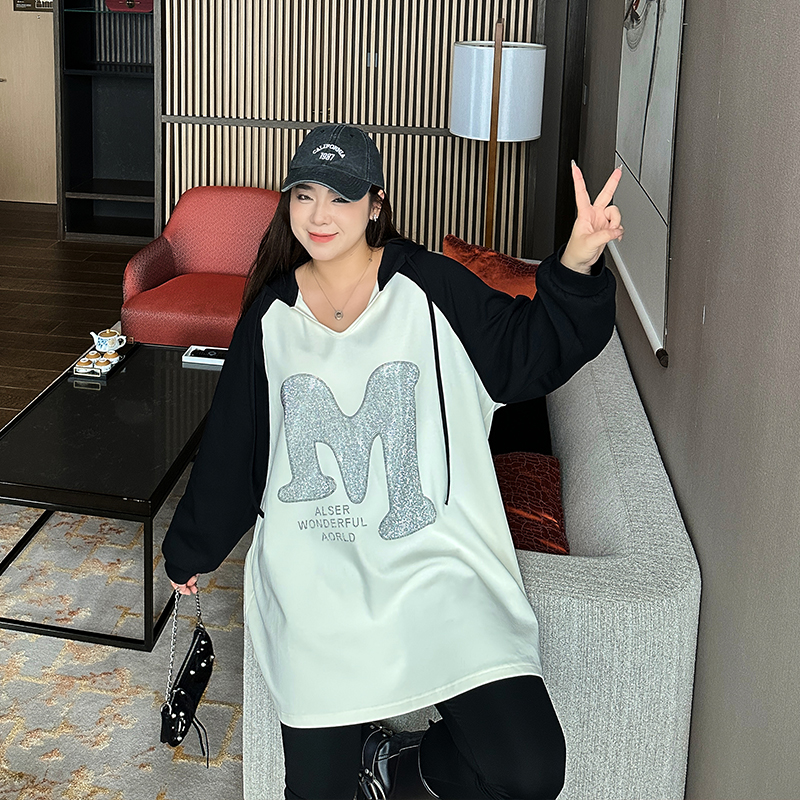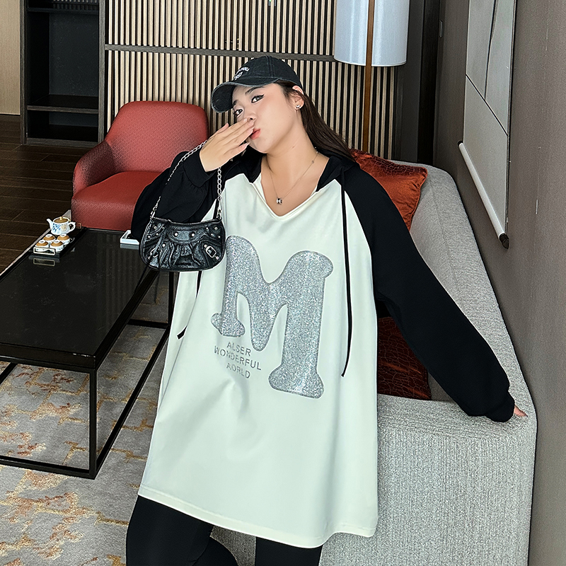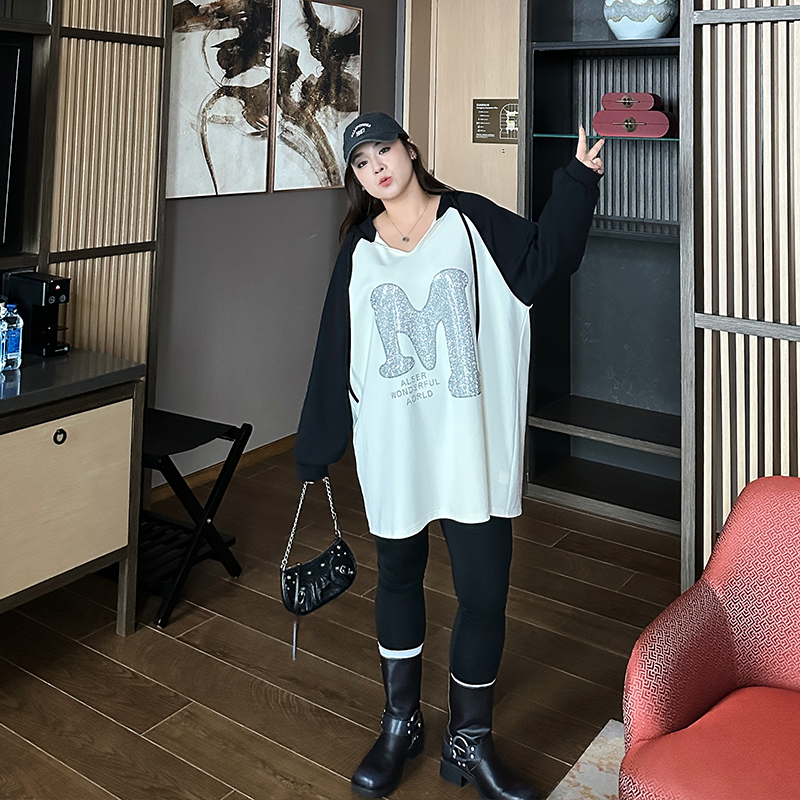 淘宝烫钻连帽上衣大码长款卫衣女装200斤加肥加大胖mm宽松遮肉长袖T恤
