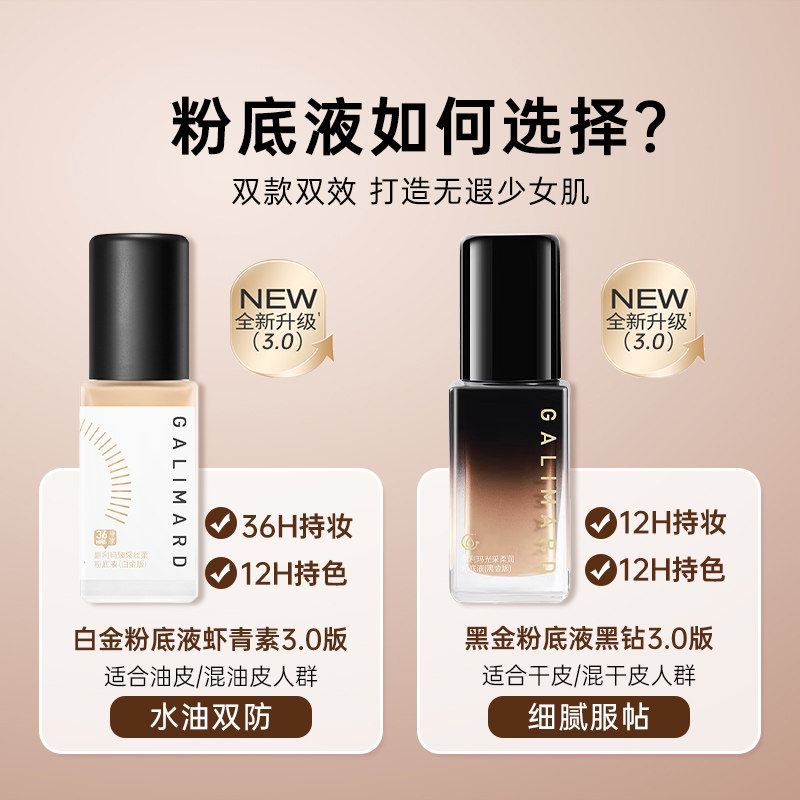 GALIMARD嘉利玛黑钻虾青素粉底液是品牌2023年秋冬推出的高端底妆力作,融合珍稀虾青素与黑钻级养肤成分,兼具遮瑕与护肤双重功效。质地丝滑轻盈,延展性强,上脸后呈现自然柔焦的哑光妆效,持久控油不卡粉,特别适合秋冬干燥季节使用。富含抗氧化精华,有效抵御环境侵害,延缓肌肤氧化暗沉。SPF30+防晒值提供日常防护,一瓶实现隔离、遮瑕、养肤三合一。官方旗舰店正品保障,适合混合性及油性肌肤,打造通透无瑕的“妈生好皮”质感,是追求高级妆感与肌肤健康平衡的理想之选。