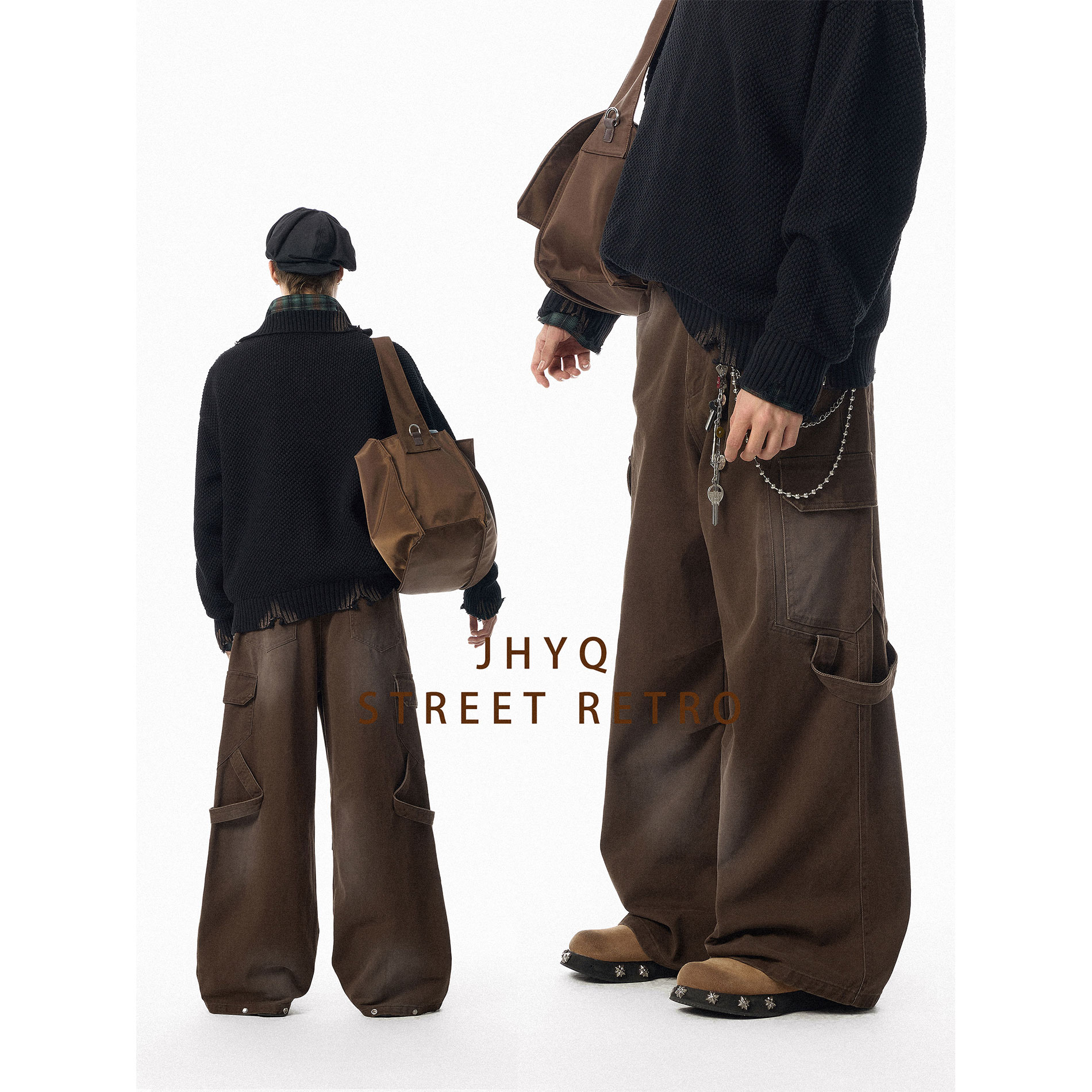 FAFC秋冬季新款水洗复古扎花牛仔裤男美式潮牌宽松休闲直筒长裤子