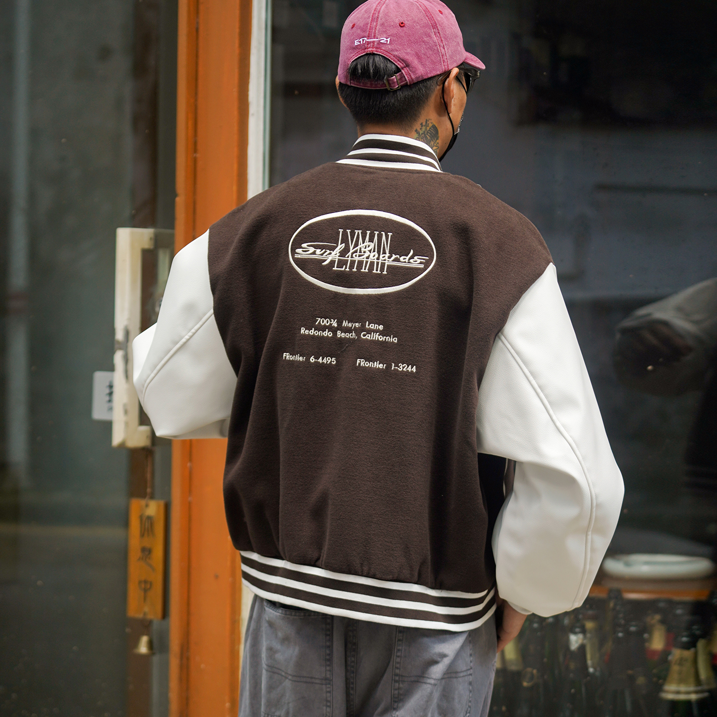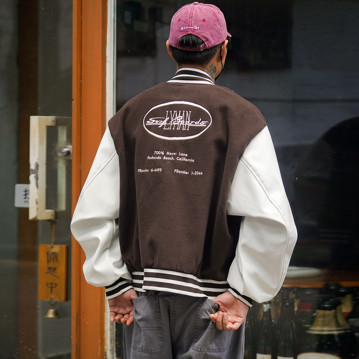 淘美式复古毛巾刺绣字母棒球服男女秋冬季潮牌拼接pu皮情侣夹克外套