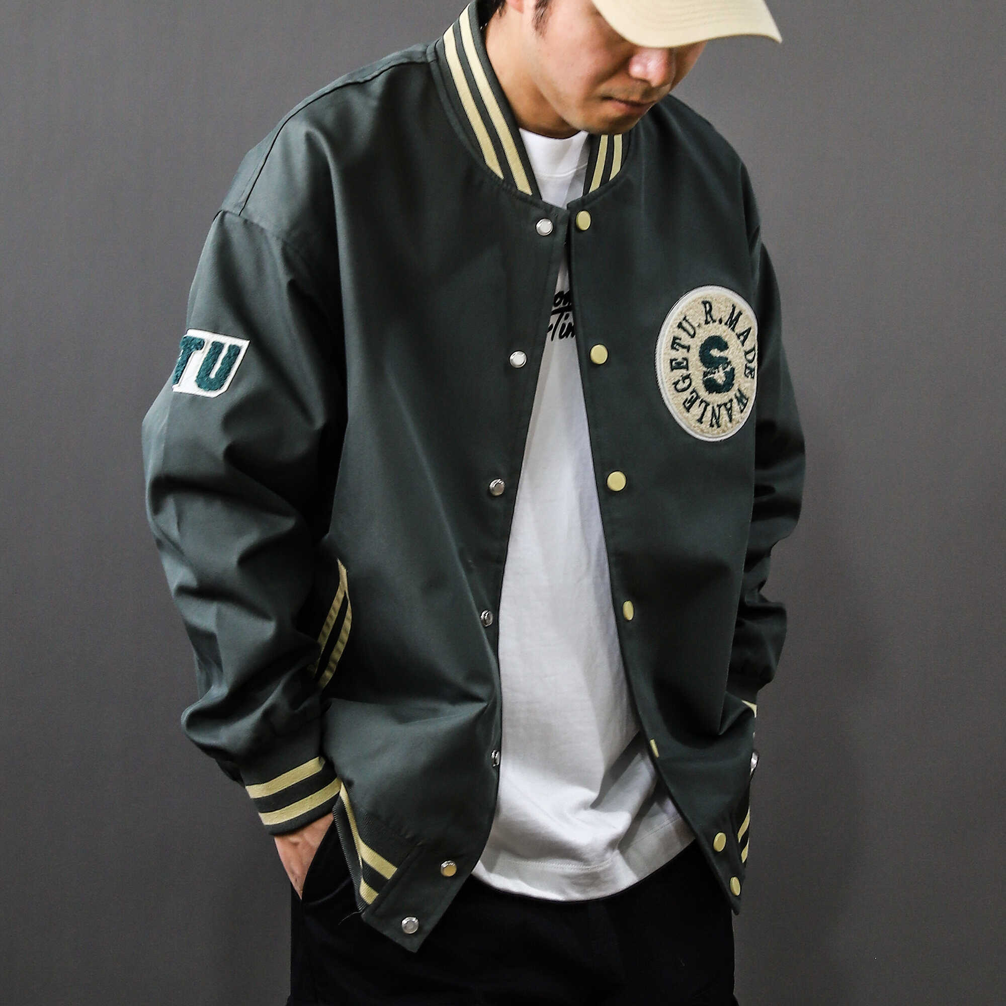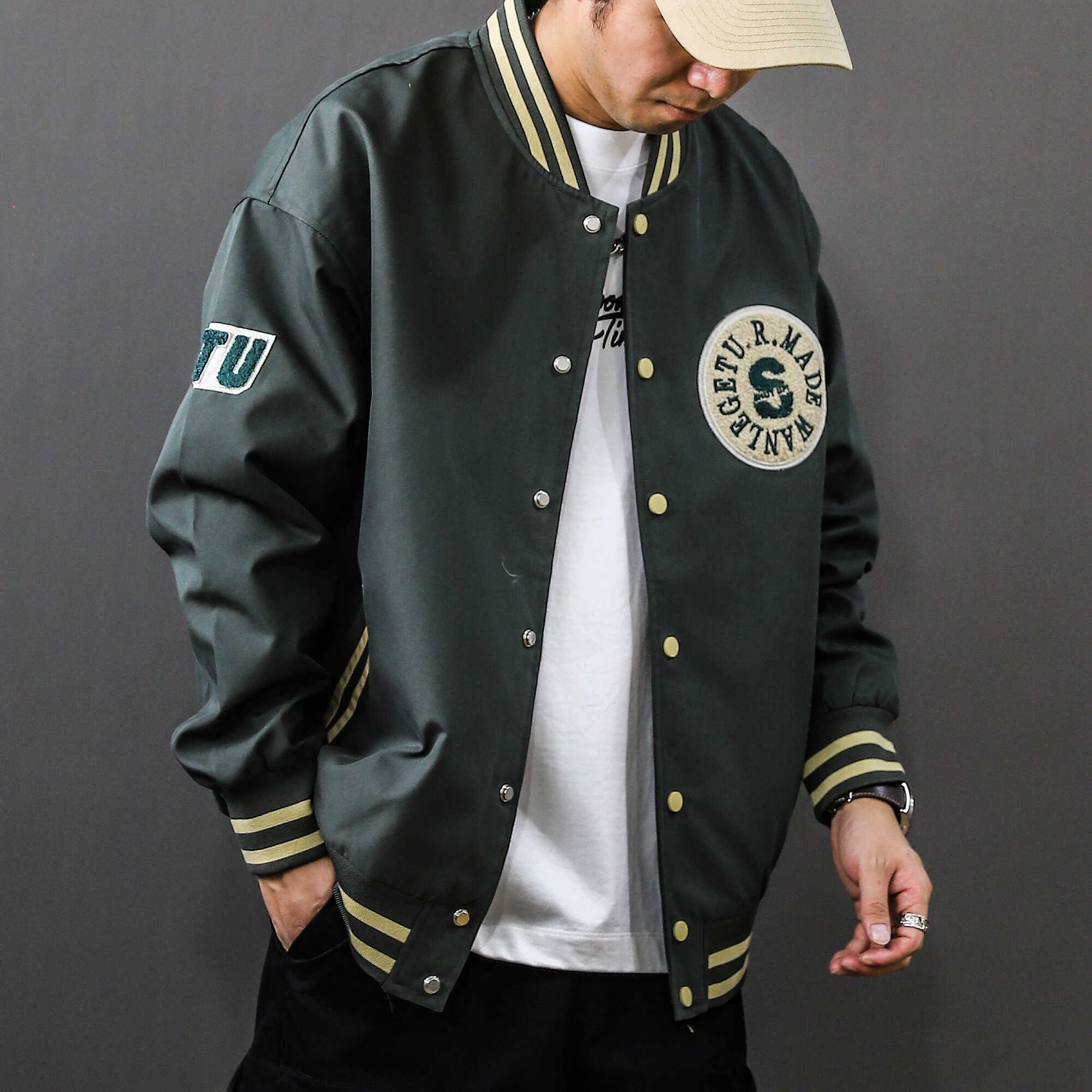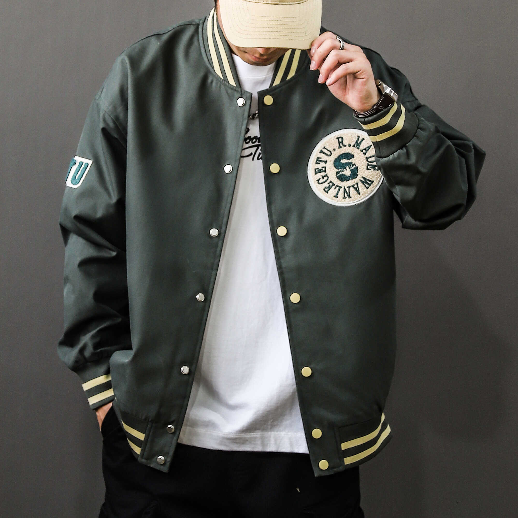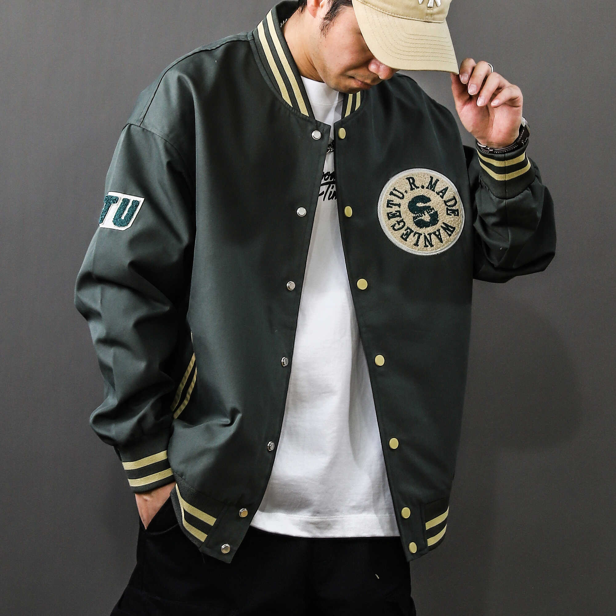 淘实体~美式街头嘻哈风阔版潮牌棒球服男款毛巾绣棒球服夹克25017