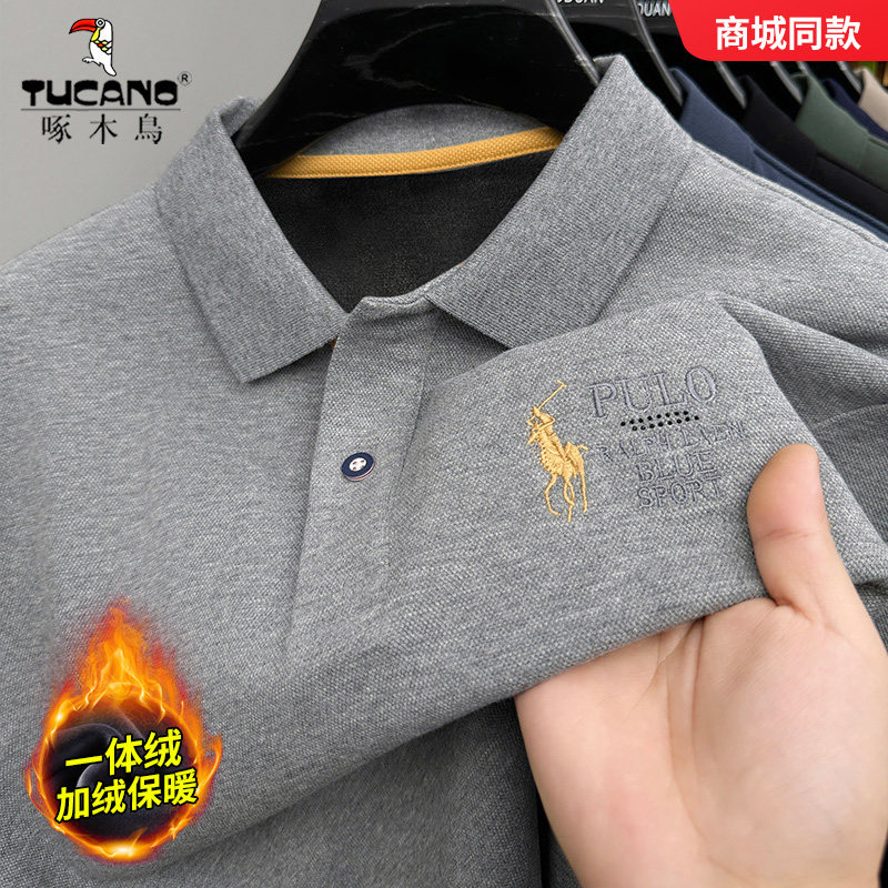 淘宝啄木鸟加绒加厚男士polo衫秋冬季高端保暖长袖t恤纯棉刺绣打底衫