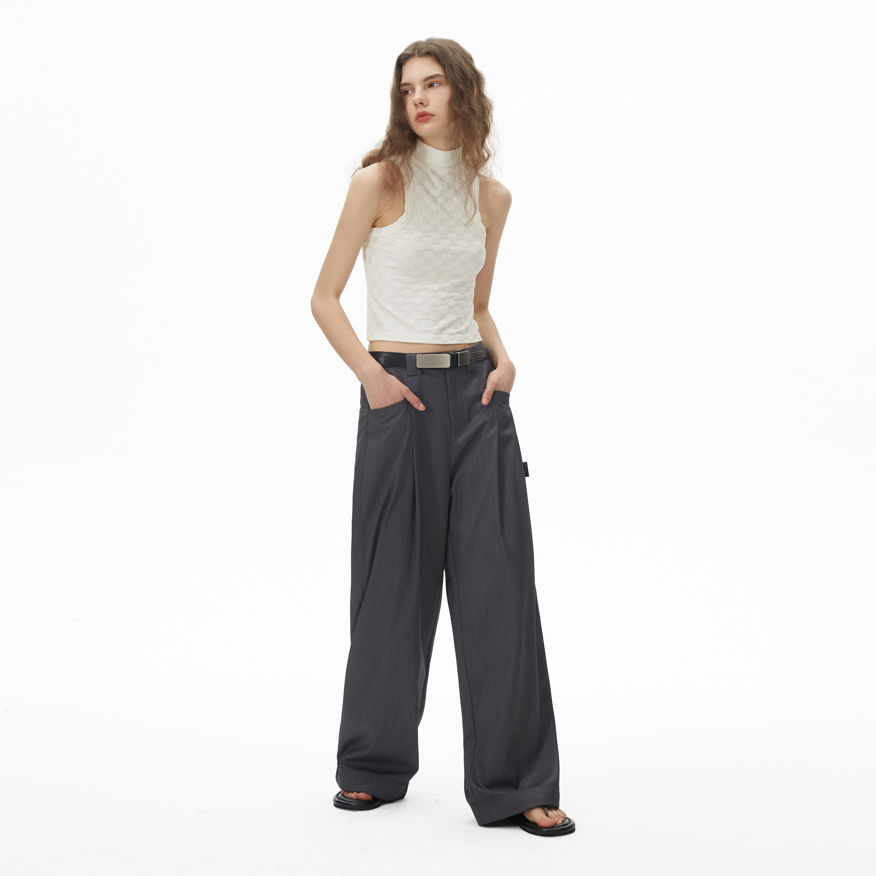 一三良品小个子 深灰通勤气质翻边系带毛呢阔腿西裤女冬拖地裤子