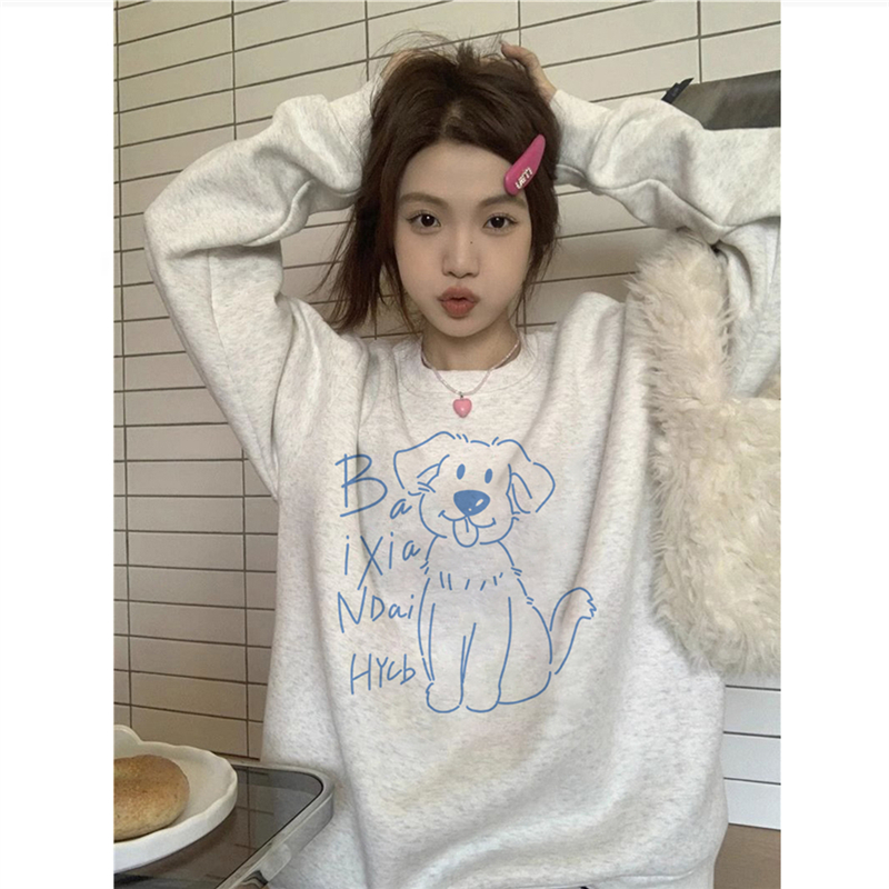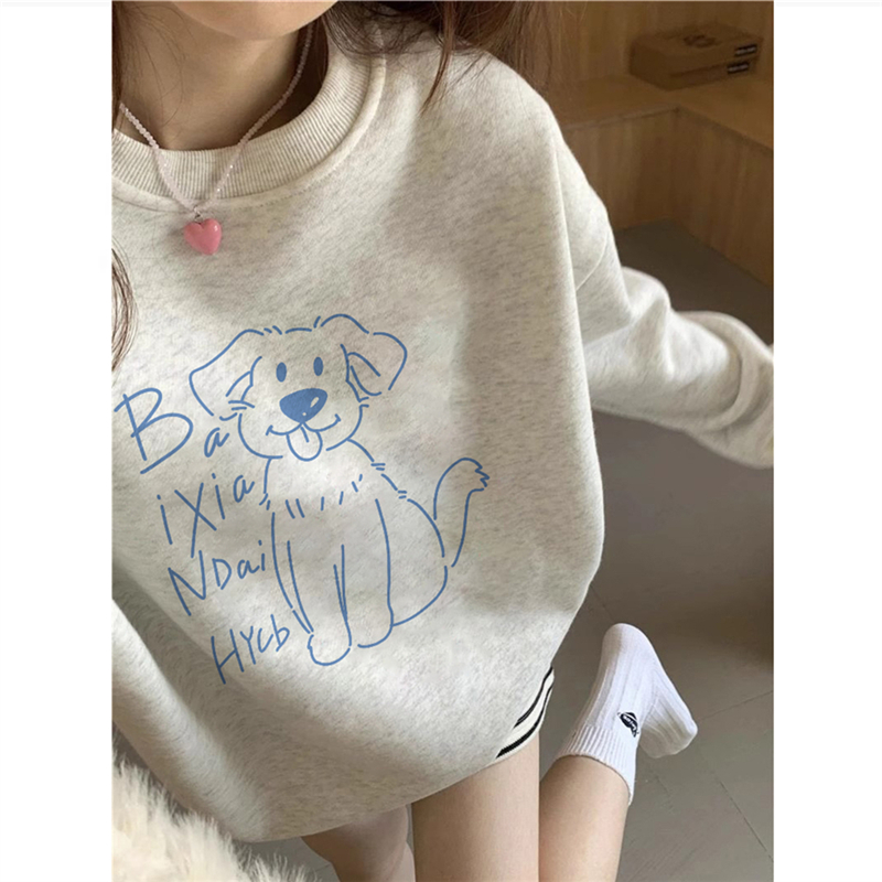 淘宝纯棉美式复古手绘狗狗无帽卫衣女冬季慵懒小众设计感加绒加厚上衣