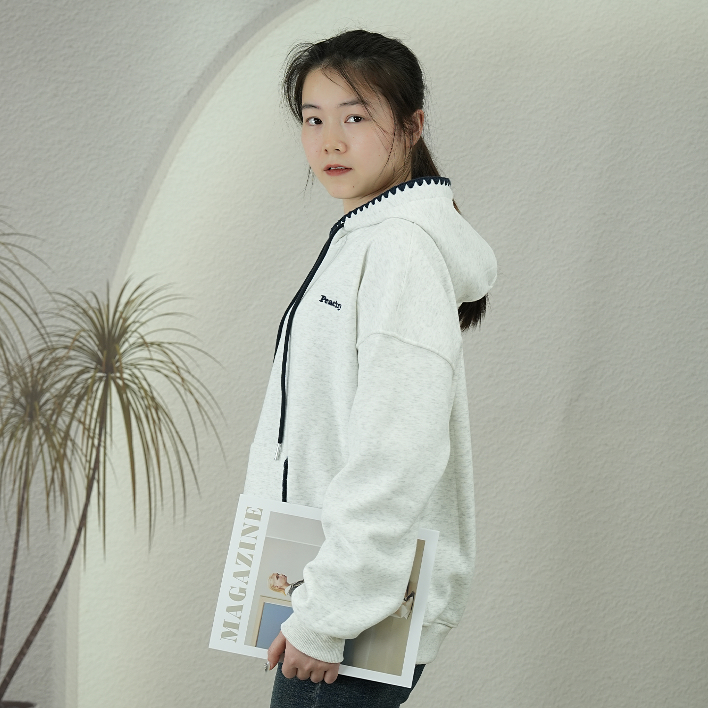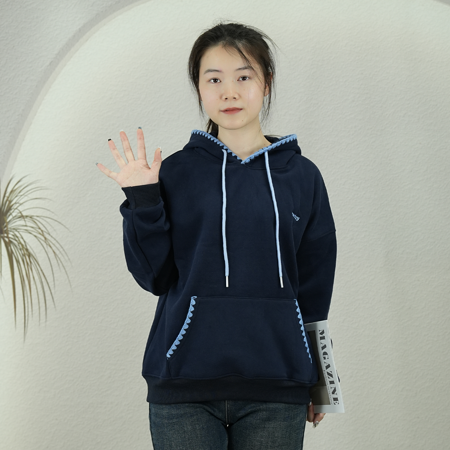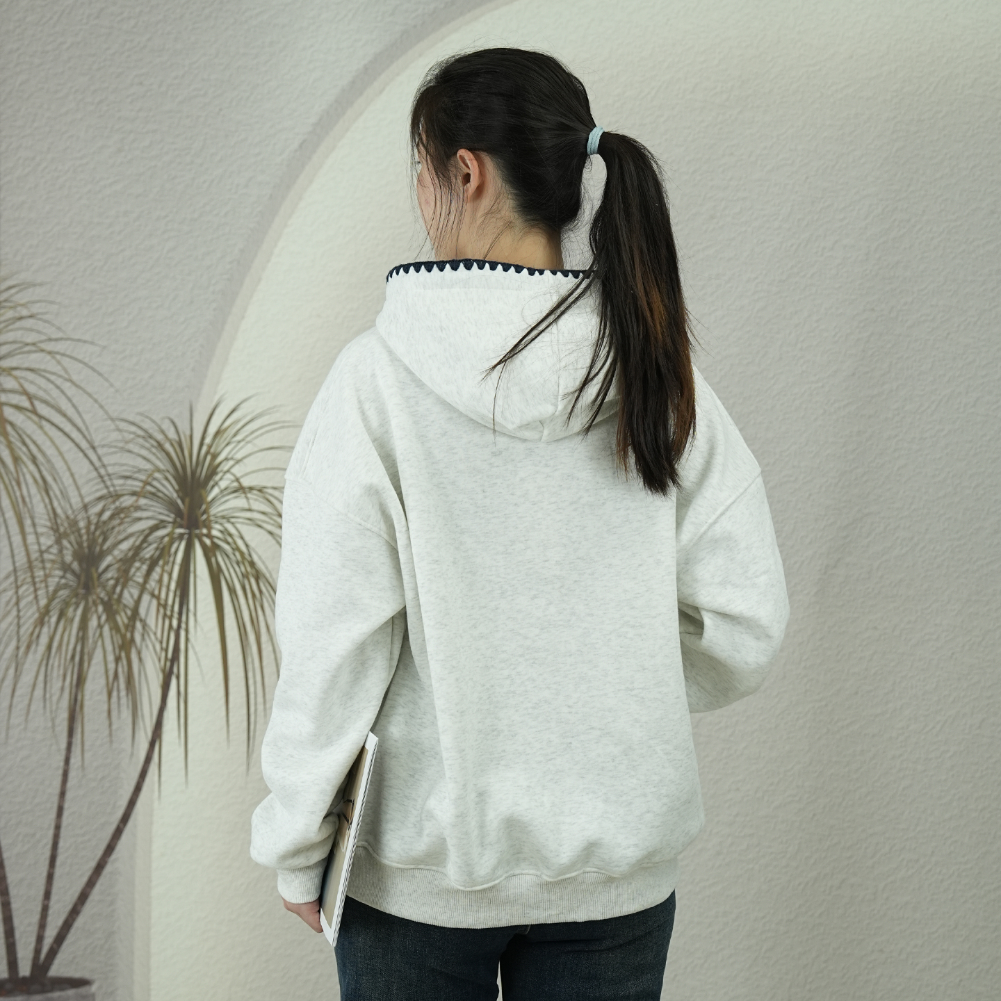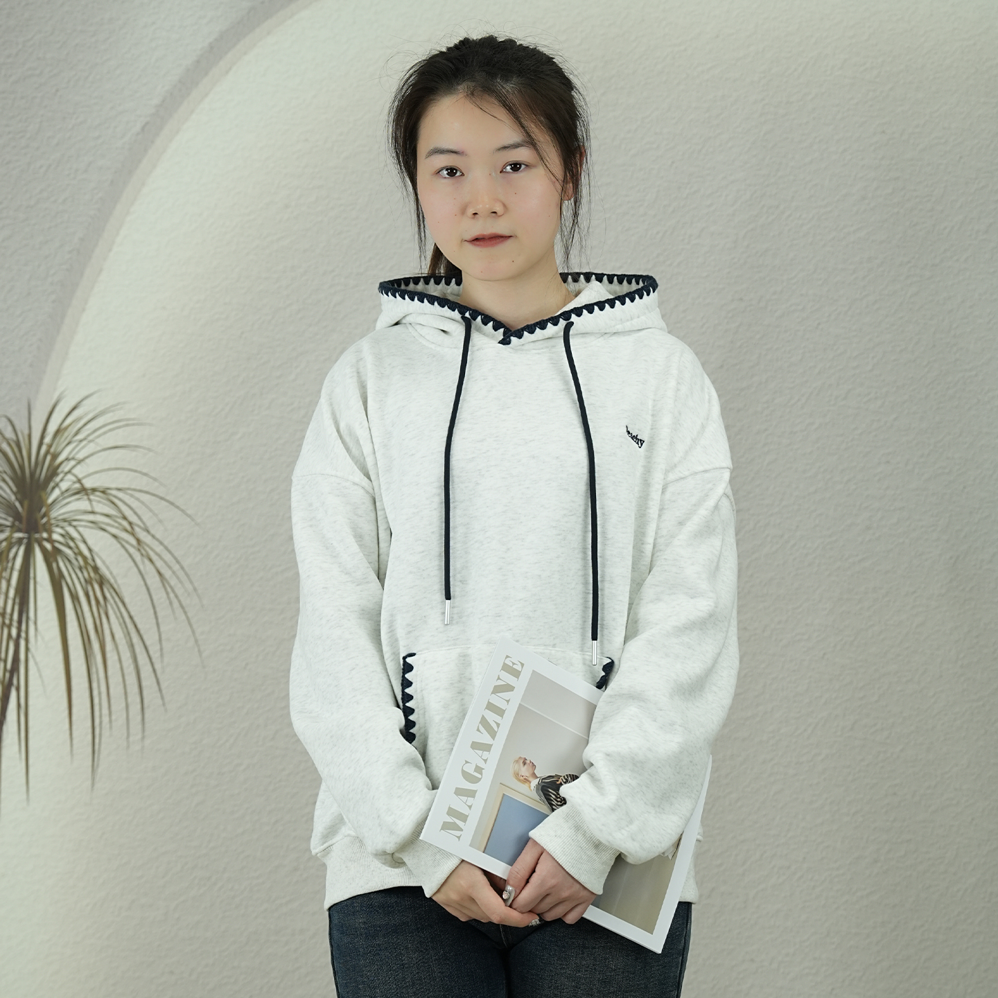 淘美式高街织带帽衫刺绣花朵卫衣女秋冬加绒重磅灰色情侣装连帽外套