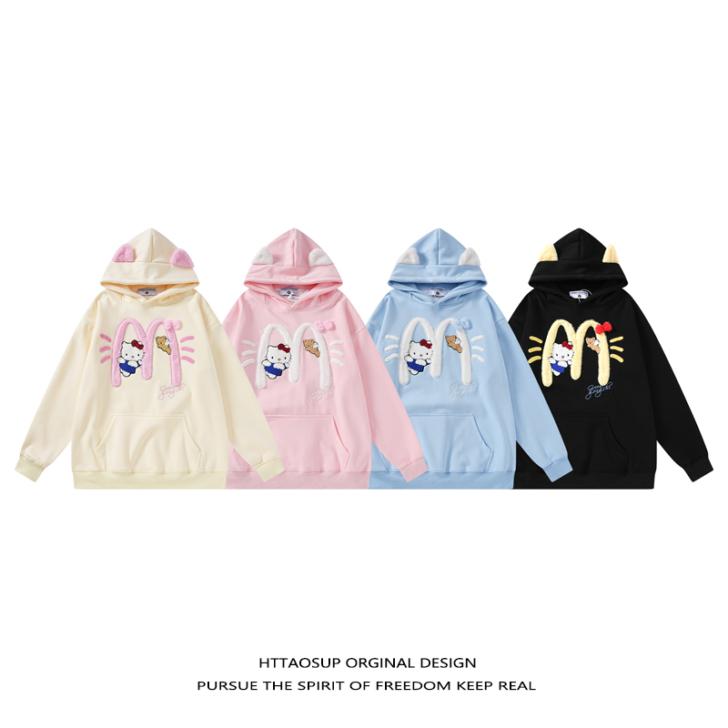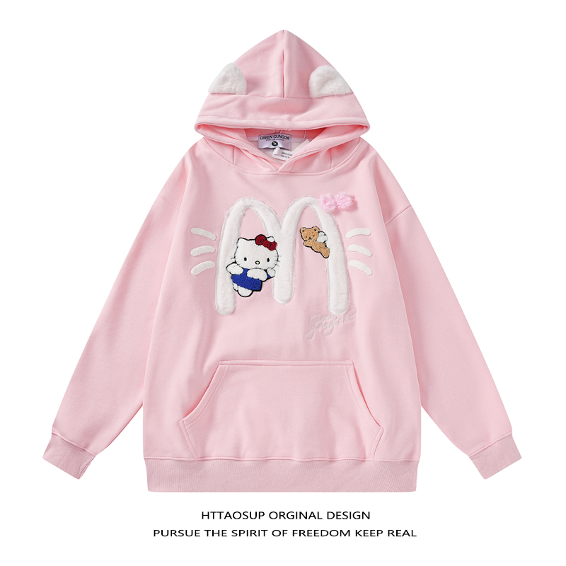 淘宝HTTAOSUP可爱卡通凯蒂猫植绒连帽加绒卫衣男女甜美宽松上衣外套潮