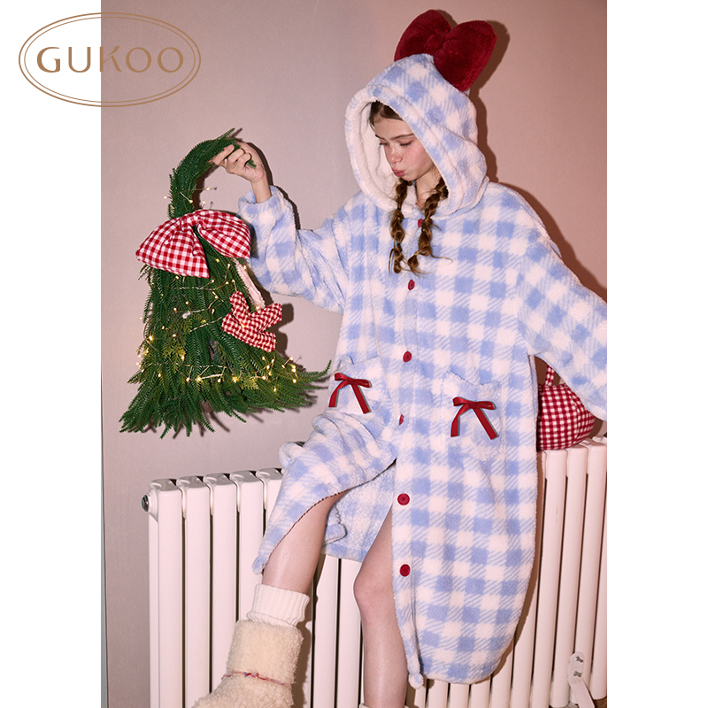 天猫Gukoo/果壳睡衣女冬款连帽冬款睡袍情侣可外穿家居服