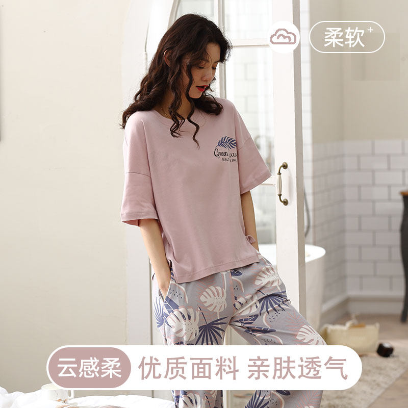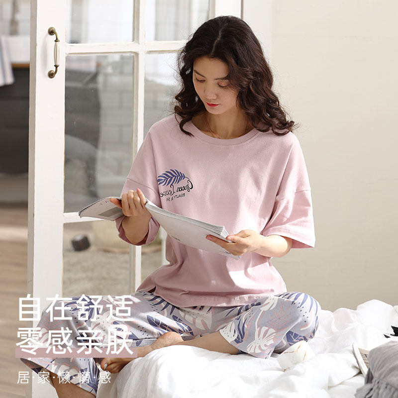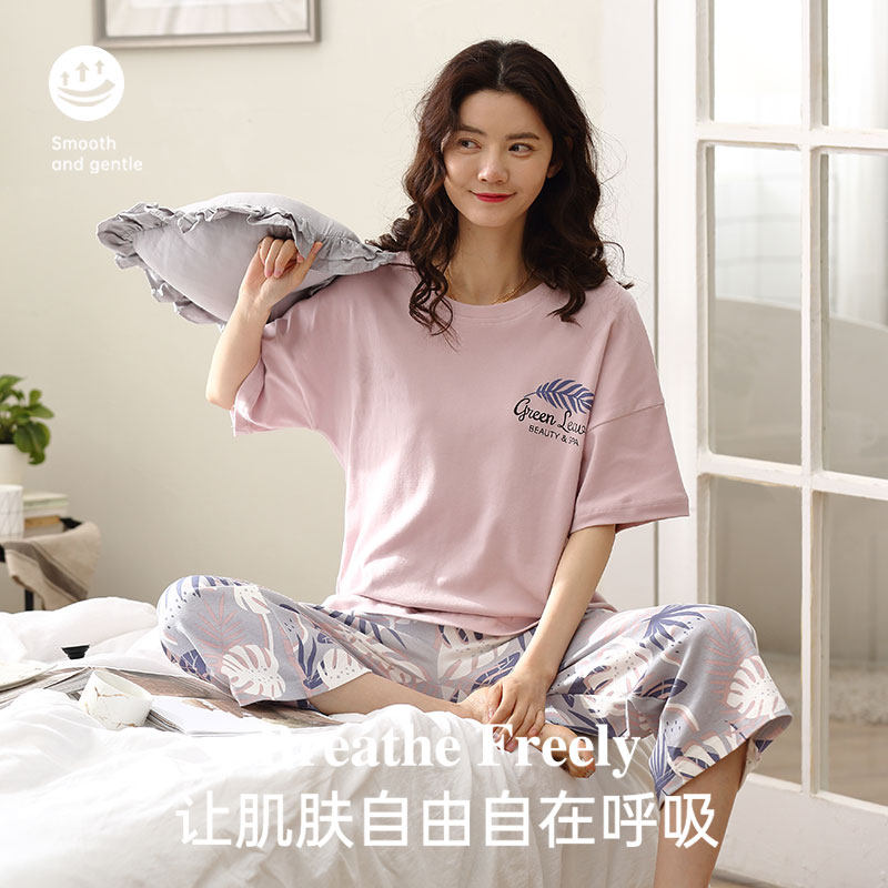 淘宝蕉晚纯棉睡衣女带胸垫短袖七分裤套装春秋季薄款休闲可外穿家居服