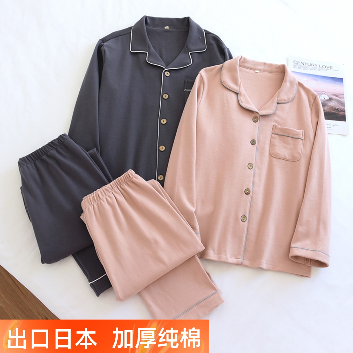 淘宝出口日本加厚纯棉情侣睡衣套装女春秋季长袖家居服男士纯色大码