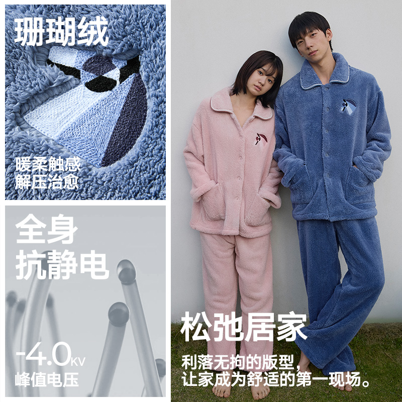 芬腾海岛绒情侣睡衣秋冬季保暖女士套装抗静电加厚珊瑚绒家居服男