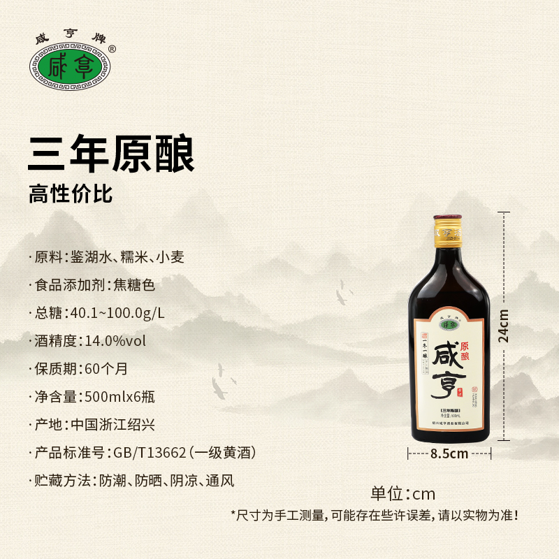 天猫咸亨黄酒三年原酿绍兴黄酒500ml*6瓶礼盒14度半甜型糯米花雕酒
