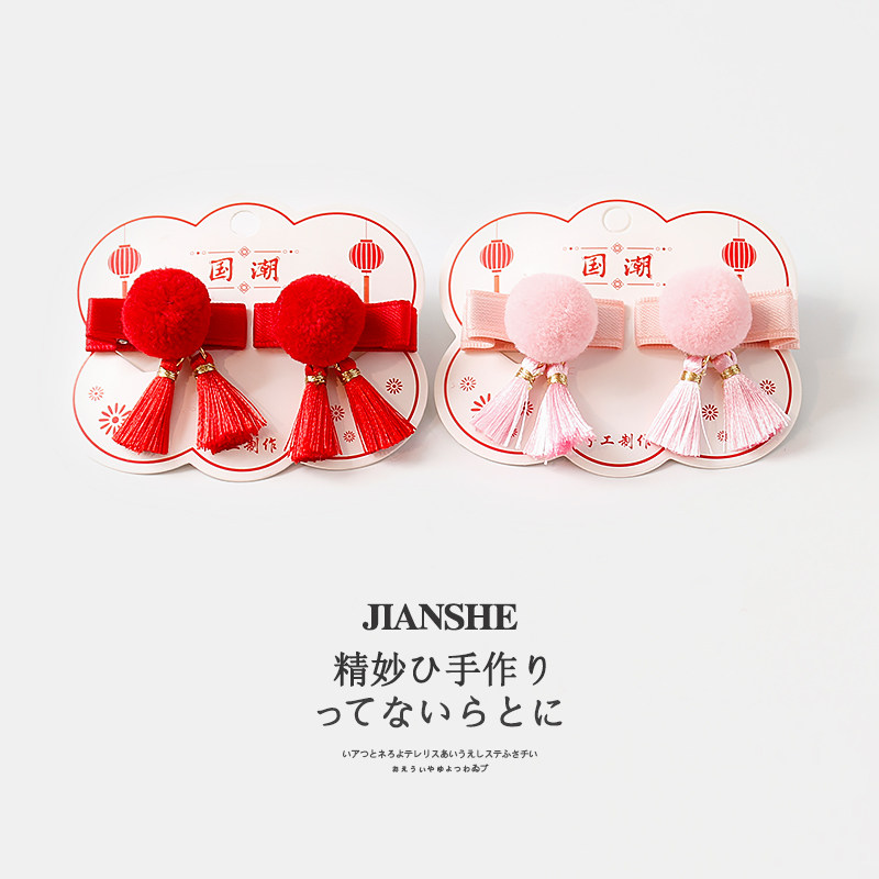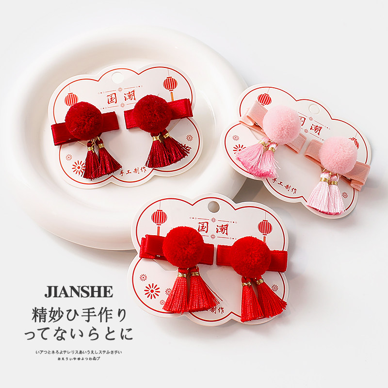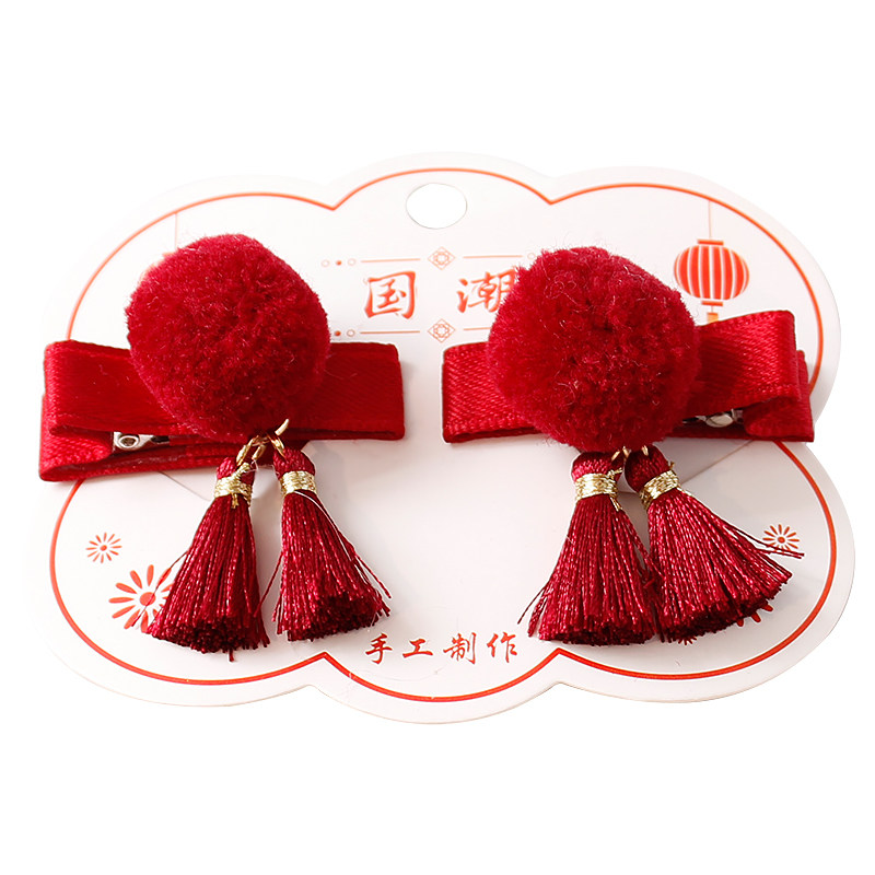 淘宝红色喜庆宝宝迷你毛球包布发夹婴儿可爱抓周流苏头饰女童对夹发饰
