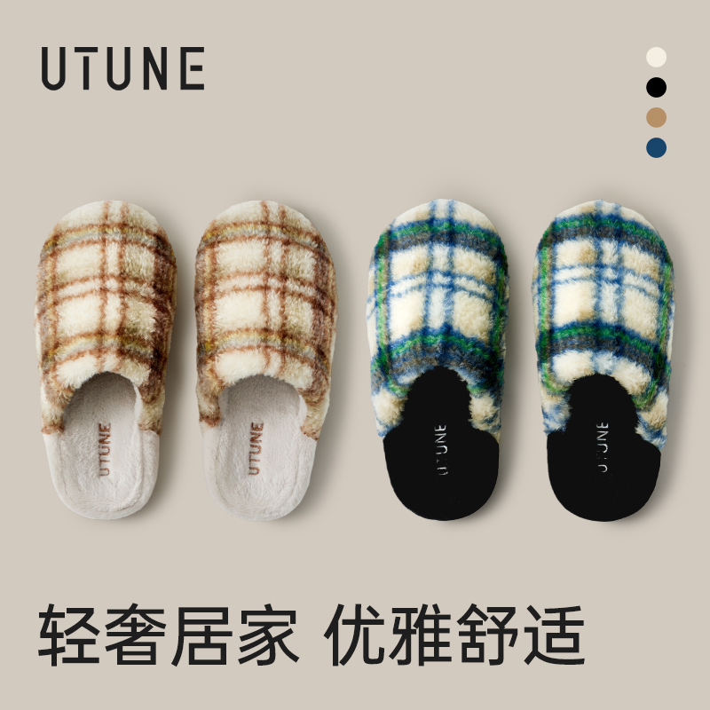 天猫优调复古高级感格子棉拖鞋女秋冬季室内家居情侣厚底毛绒保暖半拖