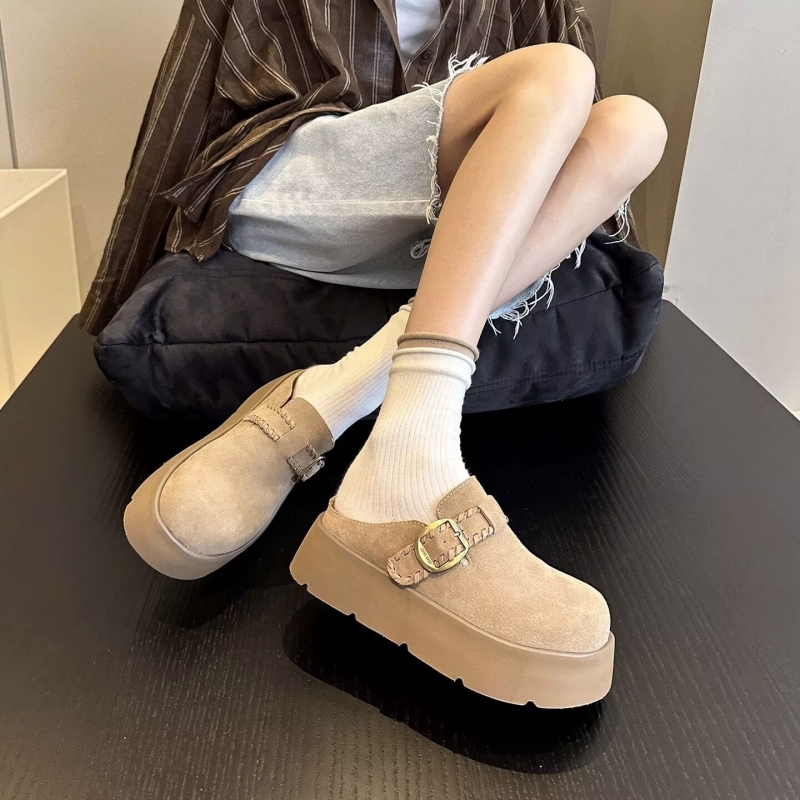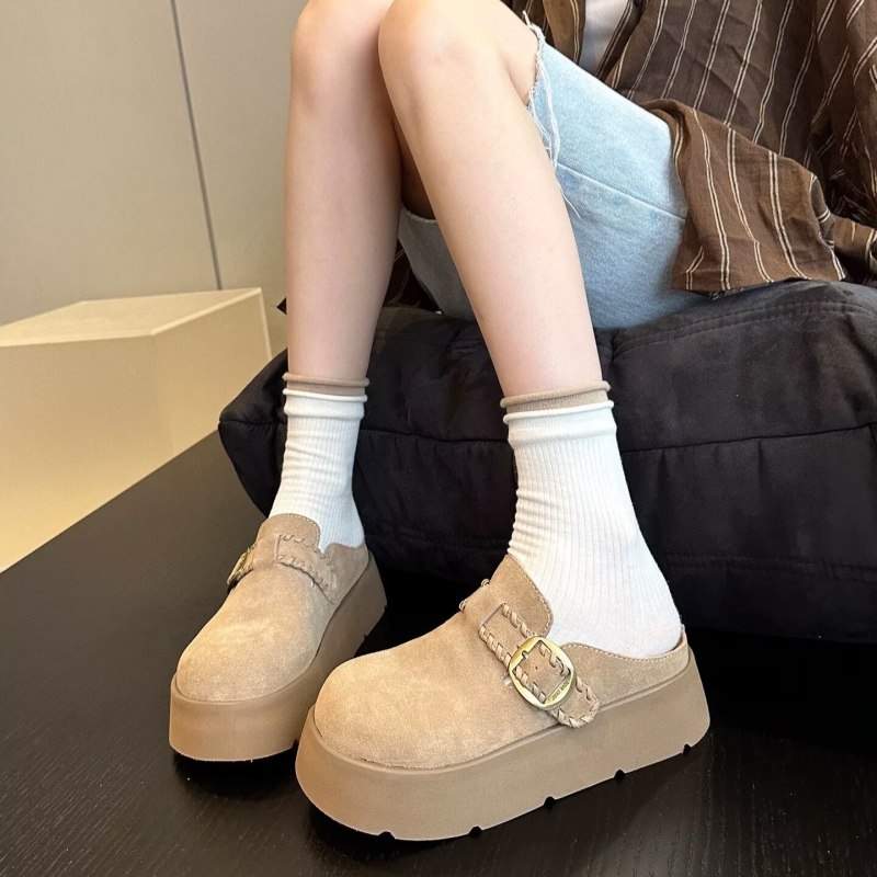 淘复古真皮厚底大头勃肯拖鞋女外穿磨砂皮增高懒人包头半拖鞋毛毛鞋