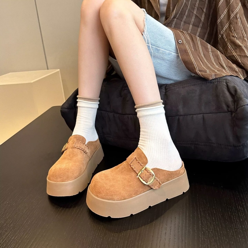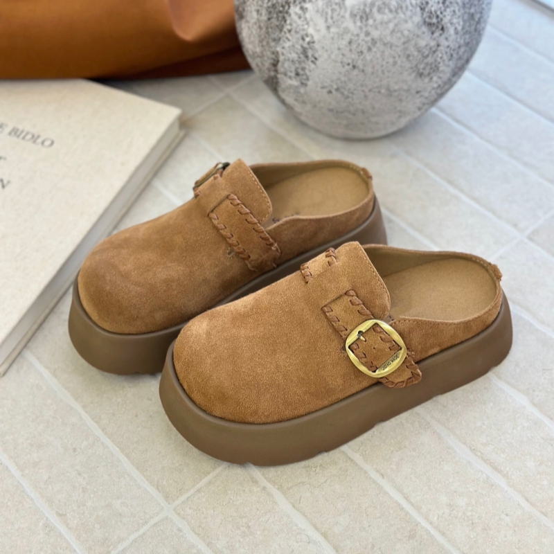 复古真皮厚底大头勃肯拖鞋女外穿磨砂皮增高懒人包头半拖鞋毛毛鞋