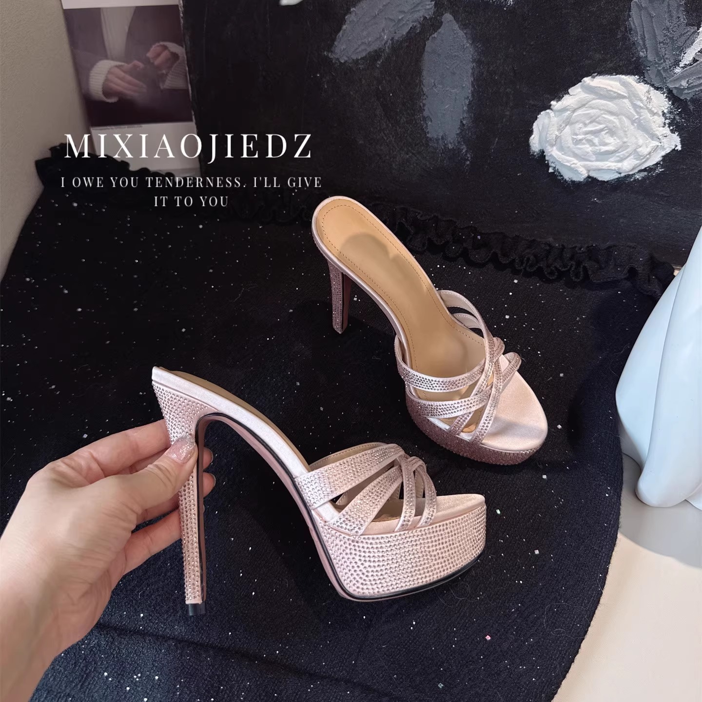 淘宝轻奢重工2025新款欧美超细高跟防水台凉鞋女露趾时尚水钻外穿拖鞋