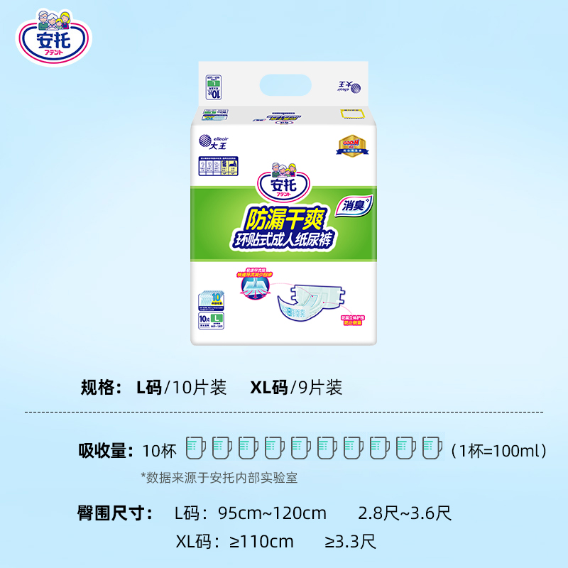 天猫大王安托成人纸尿裤环贴式尿不湿老人防漏干爽整箱L/XL8包纸尿片