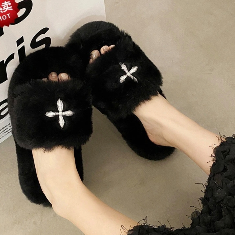 淘Lady Shoes外贸原单圆头平底毛毛拖鞋简约时尚新款舒适休闲百搭