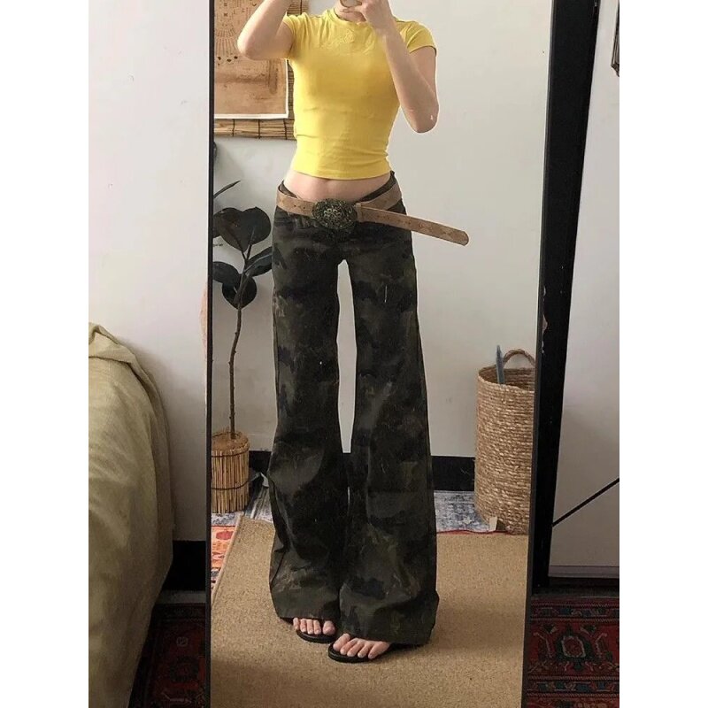 淘宝美式复古迷彩工装微喇牛仔裤女夏季低腰不贴腿显瘦马蹄喇叭裤长裤