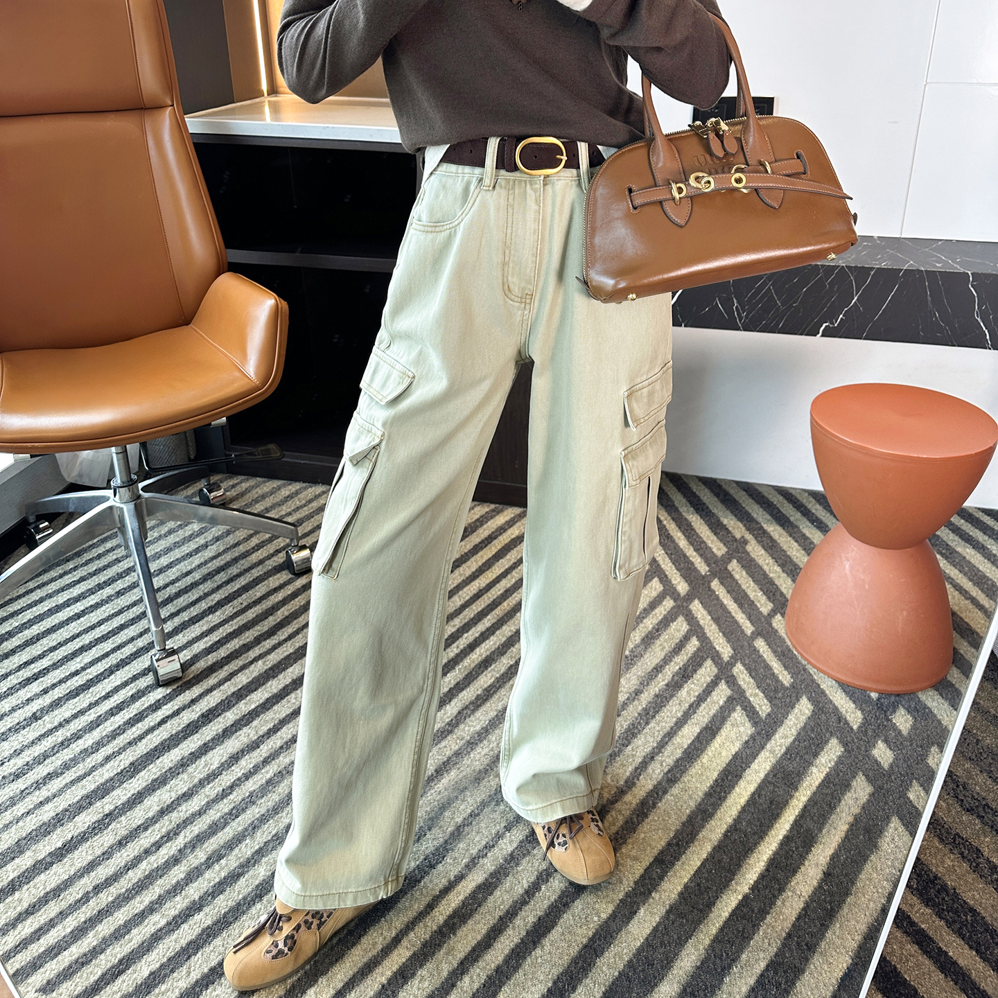 大码美式复古水洗军绿色工装牛仔裤女秋季新款街头宽松弯刀阔腿裤