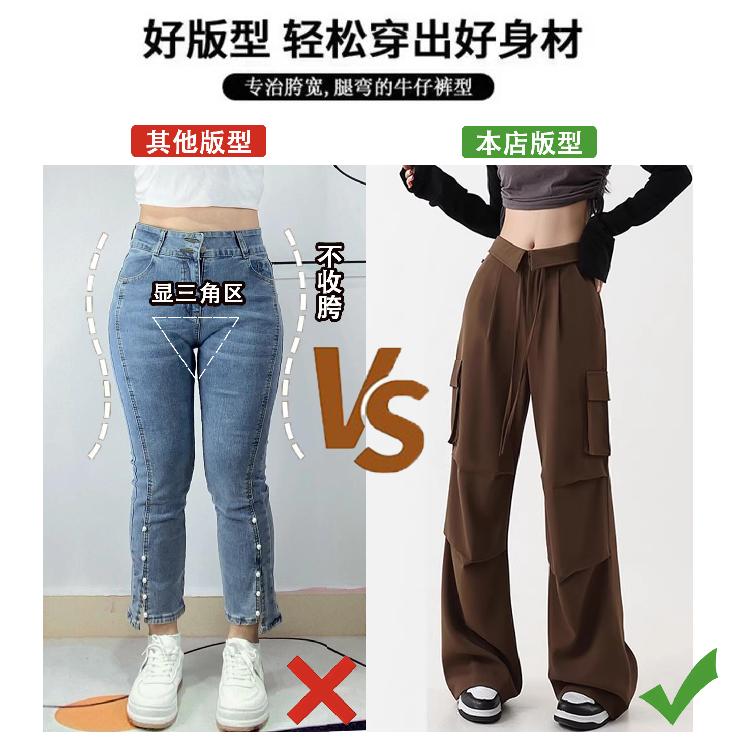 辰米范 德拉旧街区 配~腰带阔腿工装牛仔裤子女低腰宽松拼接长裤