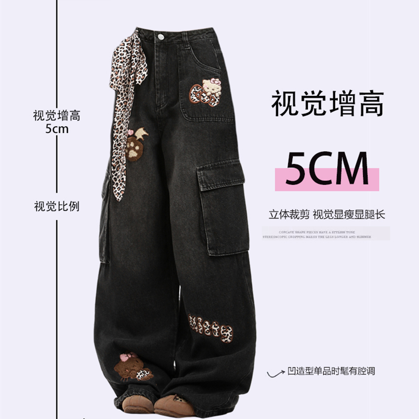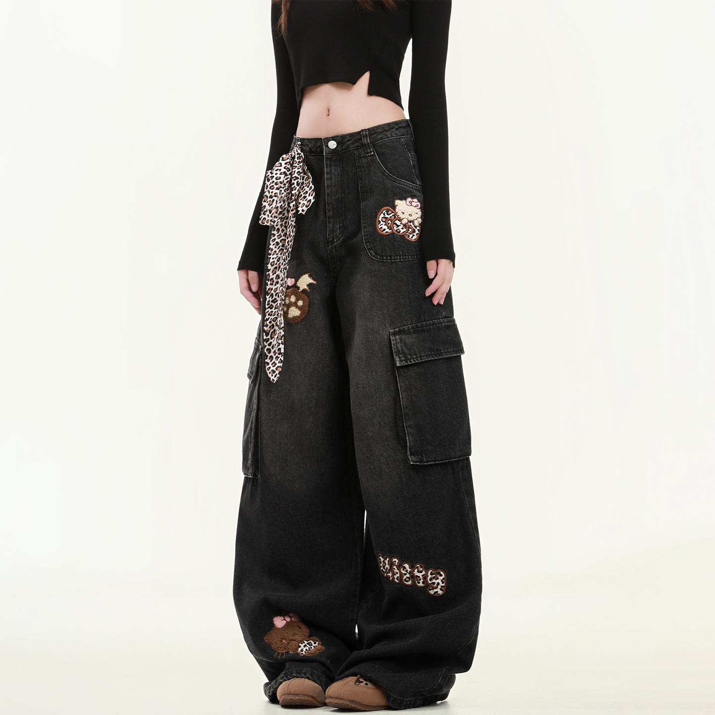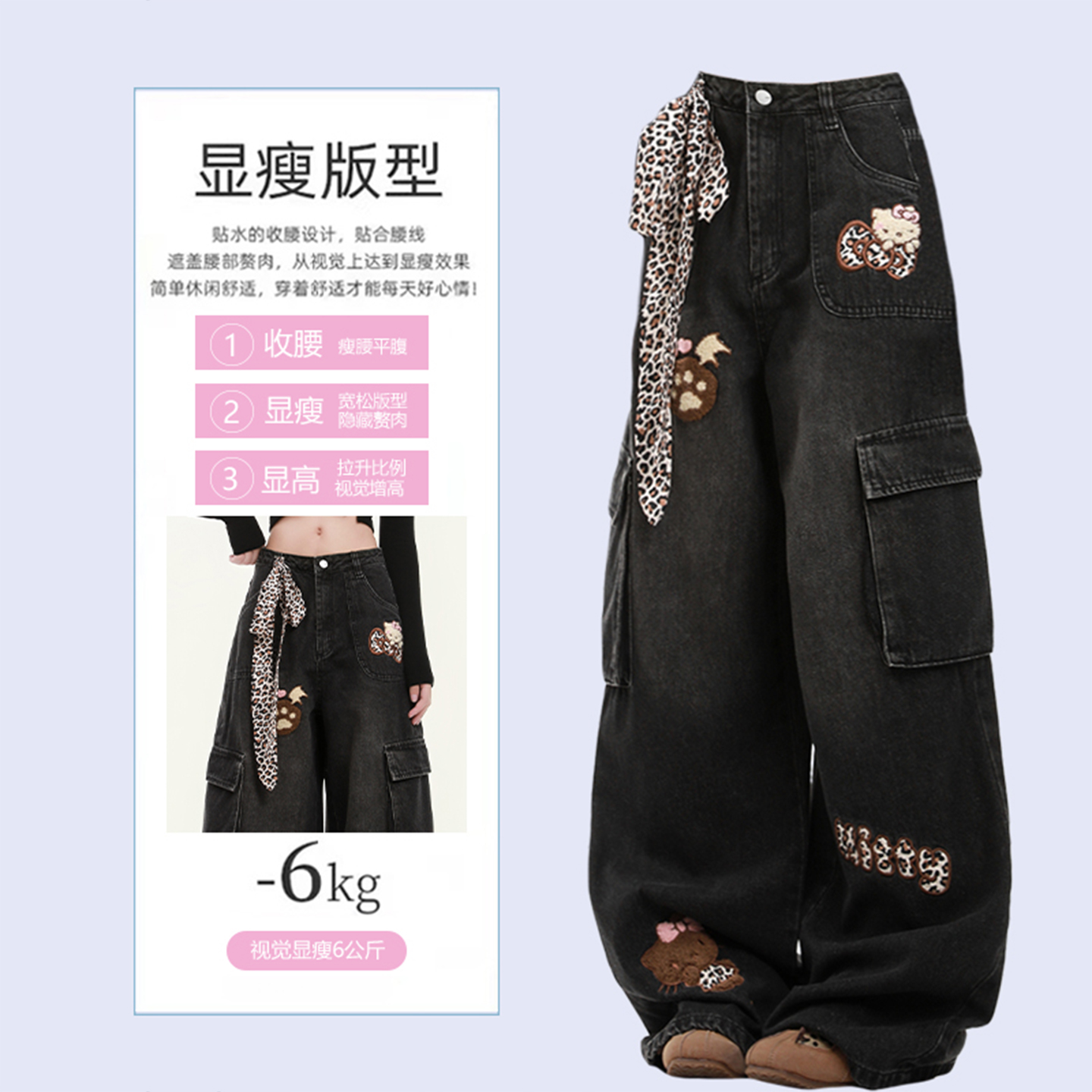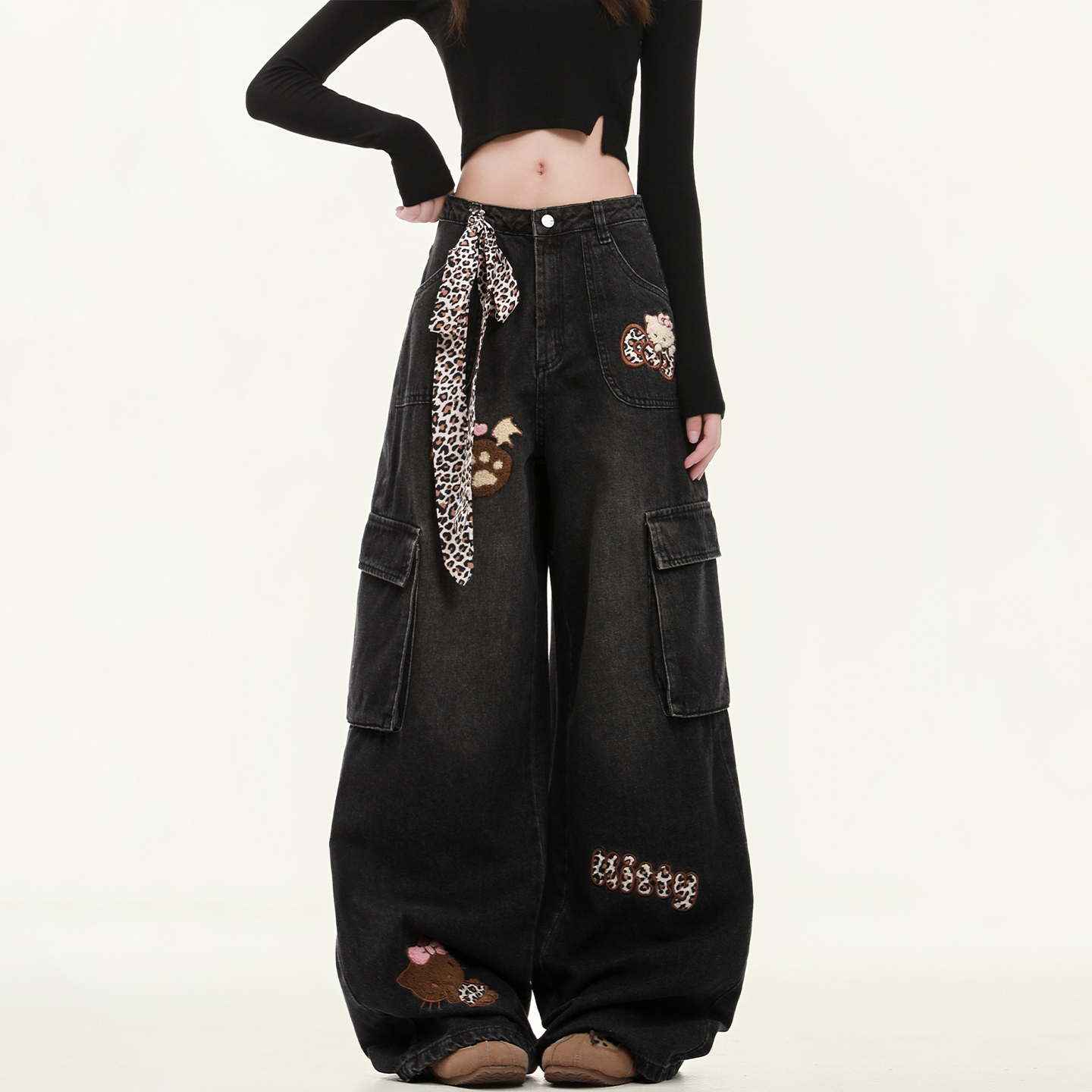 特大码女装胖mm美式卡通刺绣工装牛仔裤女高腰显瘦设计感阔腿裤潮