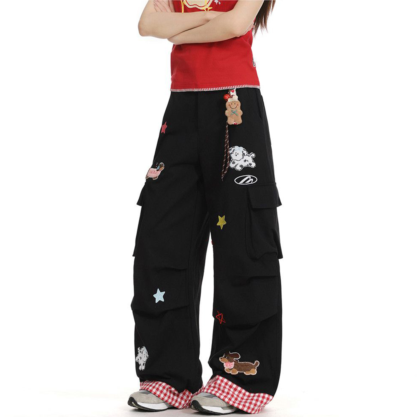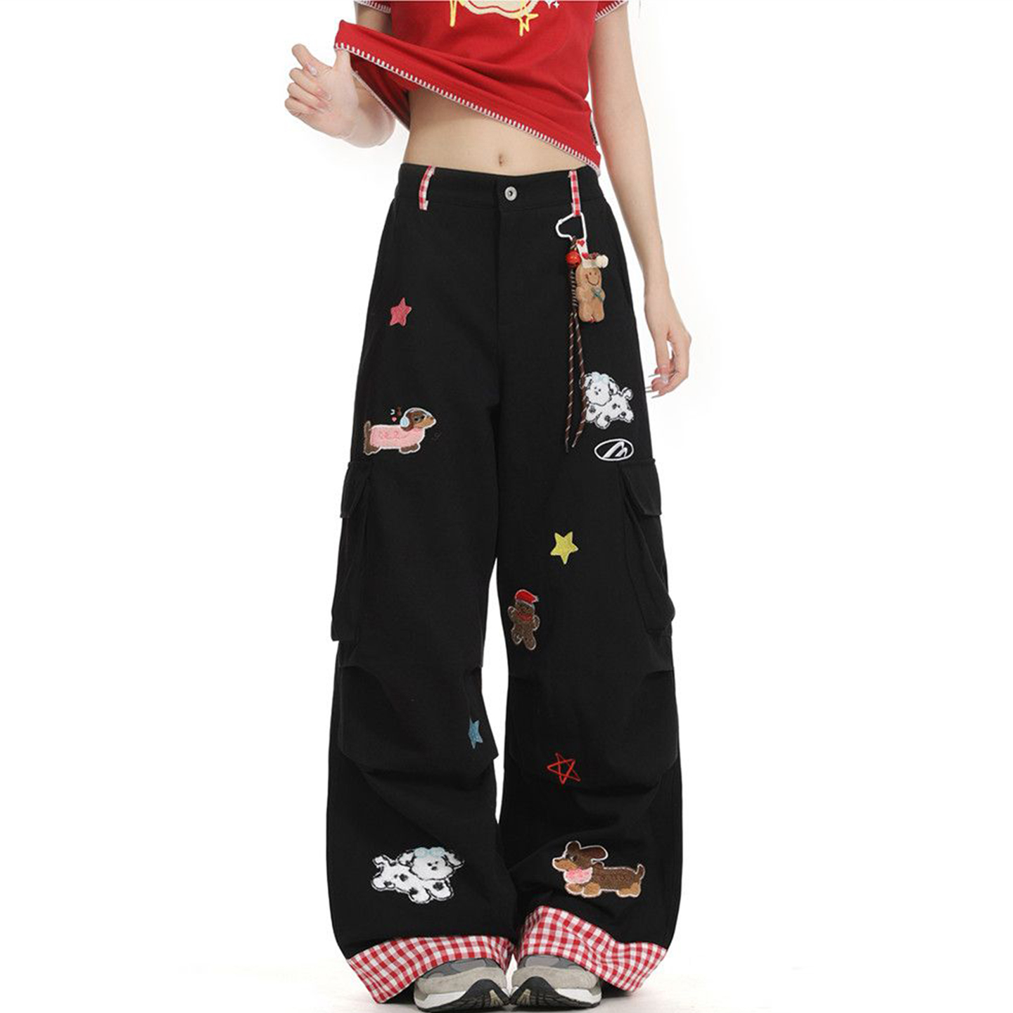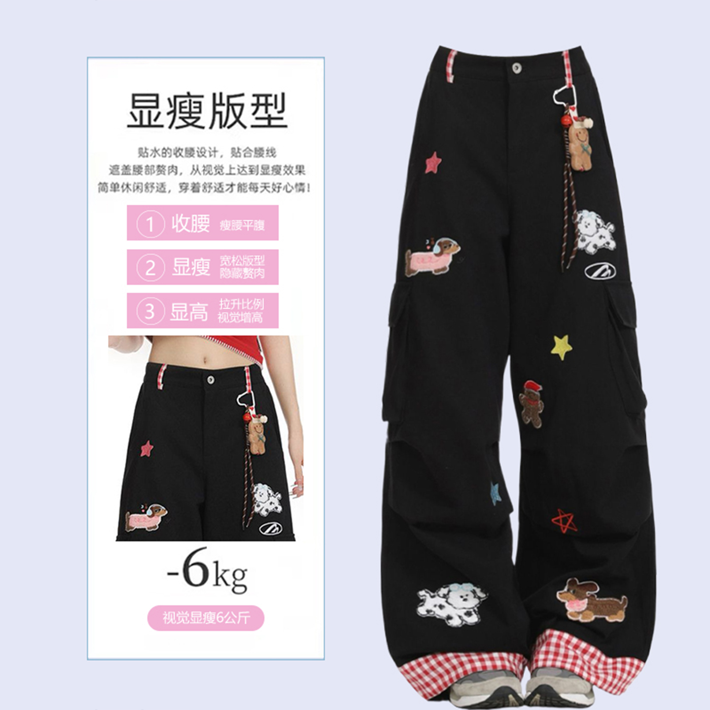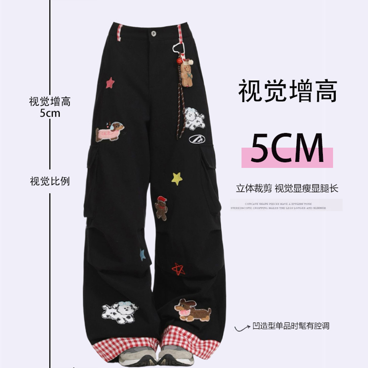 淘宝300斤特大码黑色小狗刺绣工装牛仔裤女胖mm宽松休闲百搭阔腿裤子