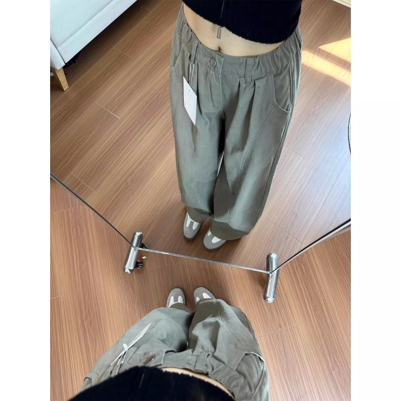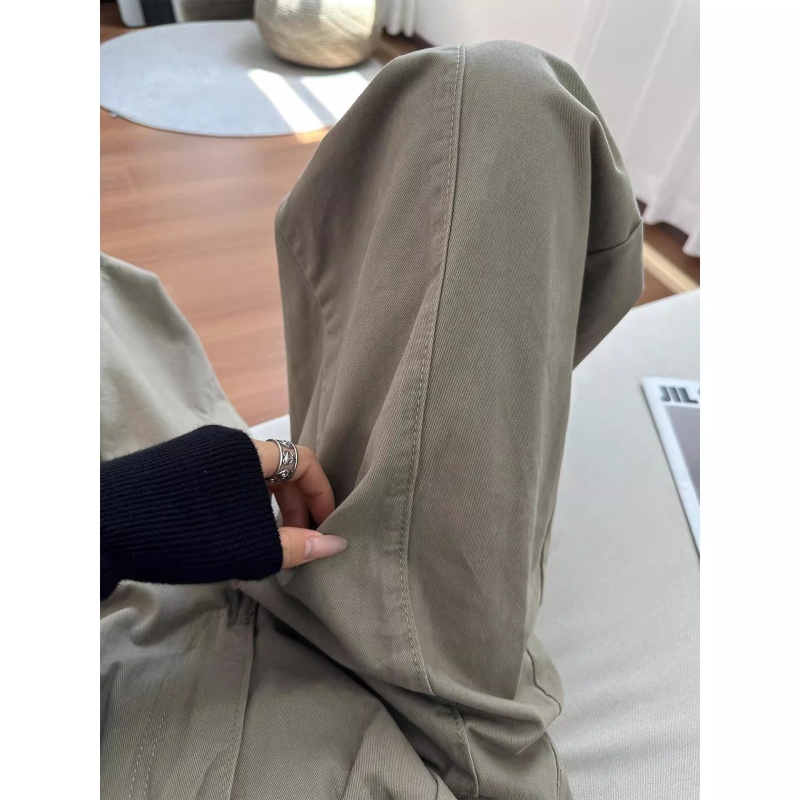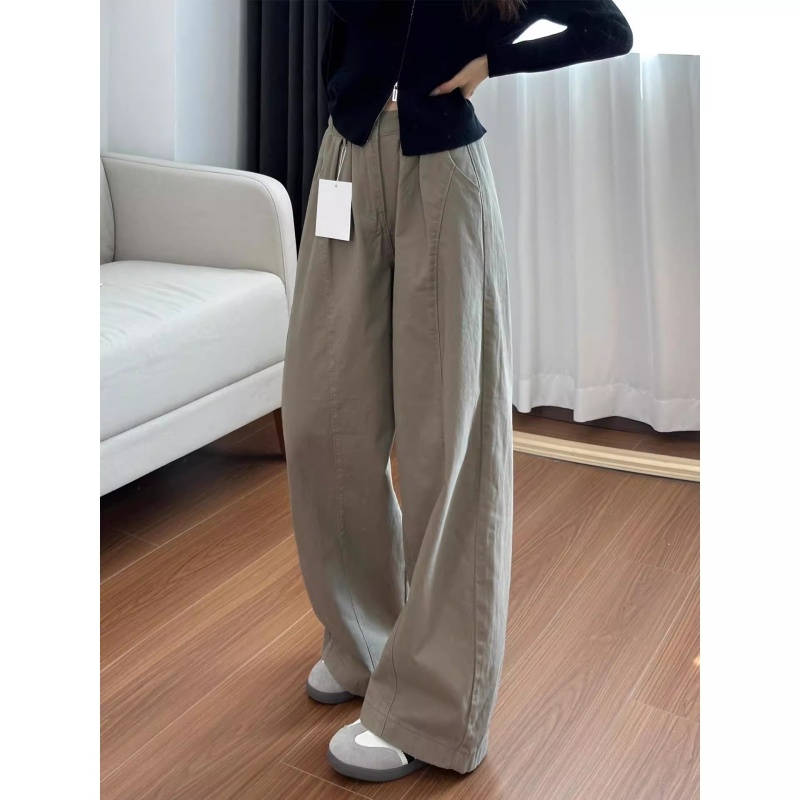 天猫美式卡其色工装休闲裤女秋季新款大码胖mm高腰宽松显瘦阔腿弯刀裤