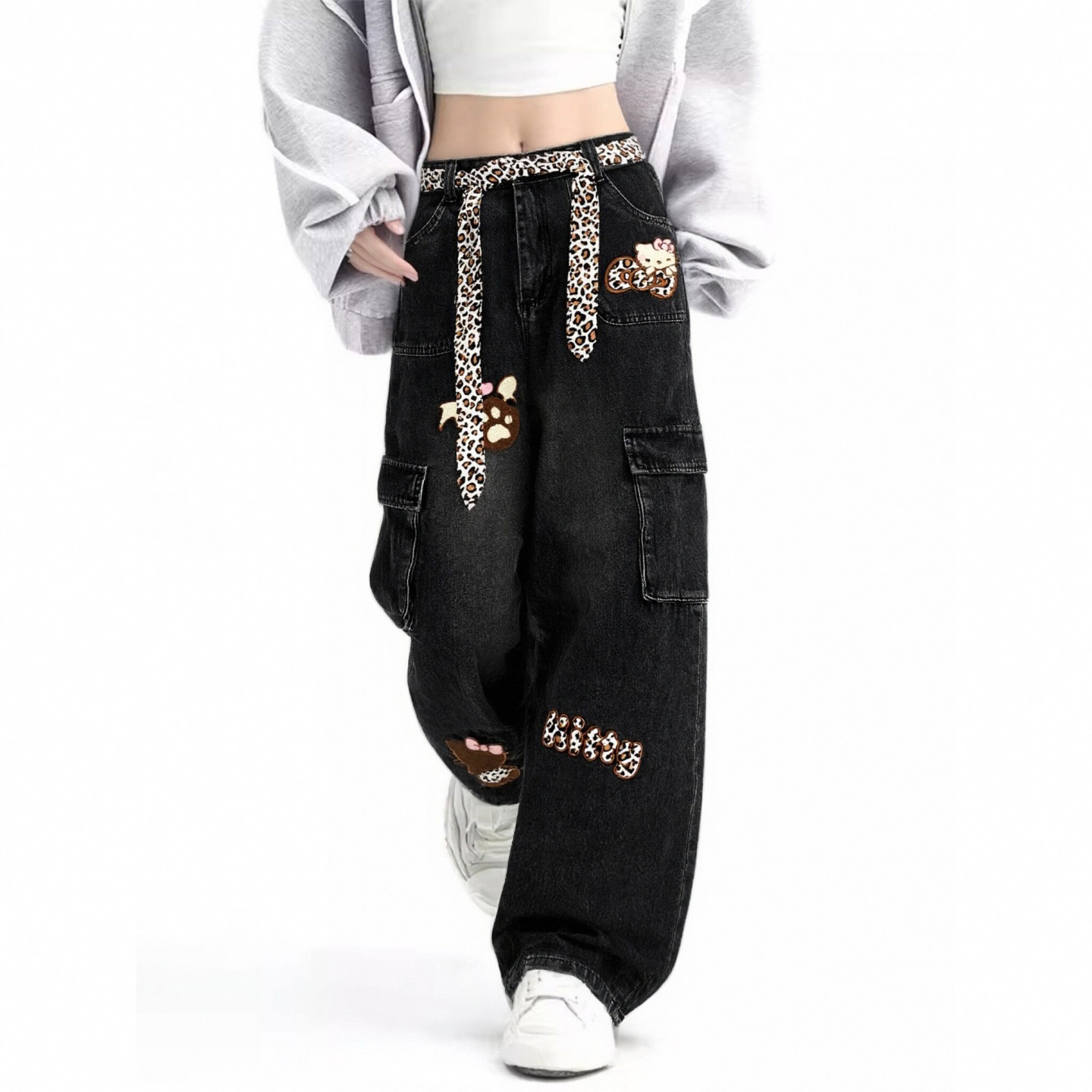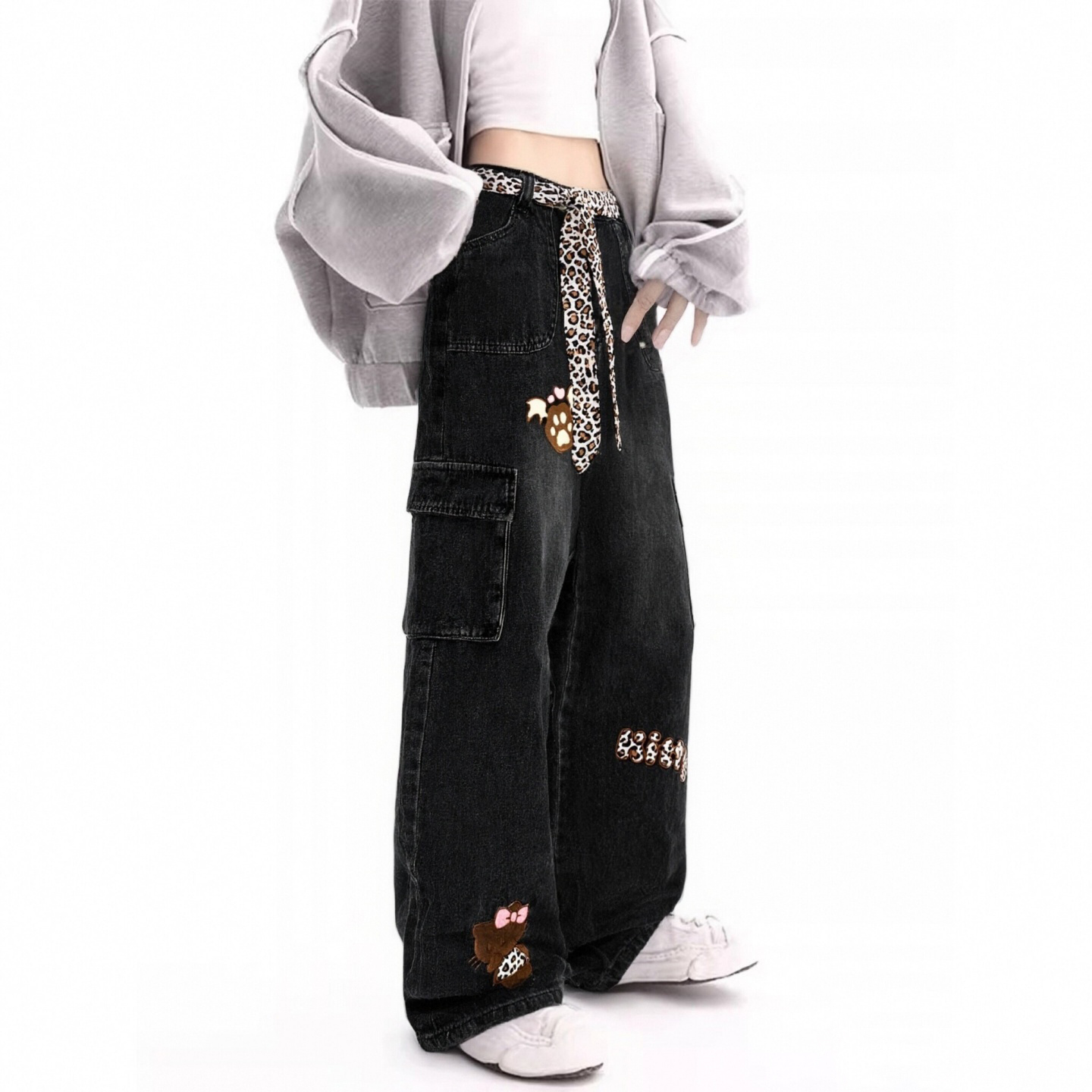 淘宝特大码女装胖mm加绒加厚豹纹刺绣工装牛仔裤女高腰显瘦百搭阔腿裤