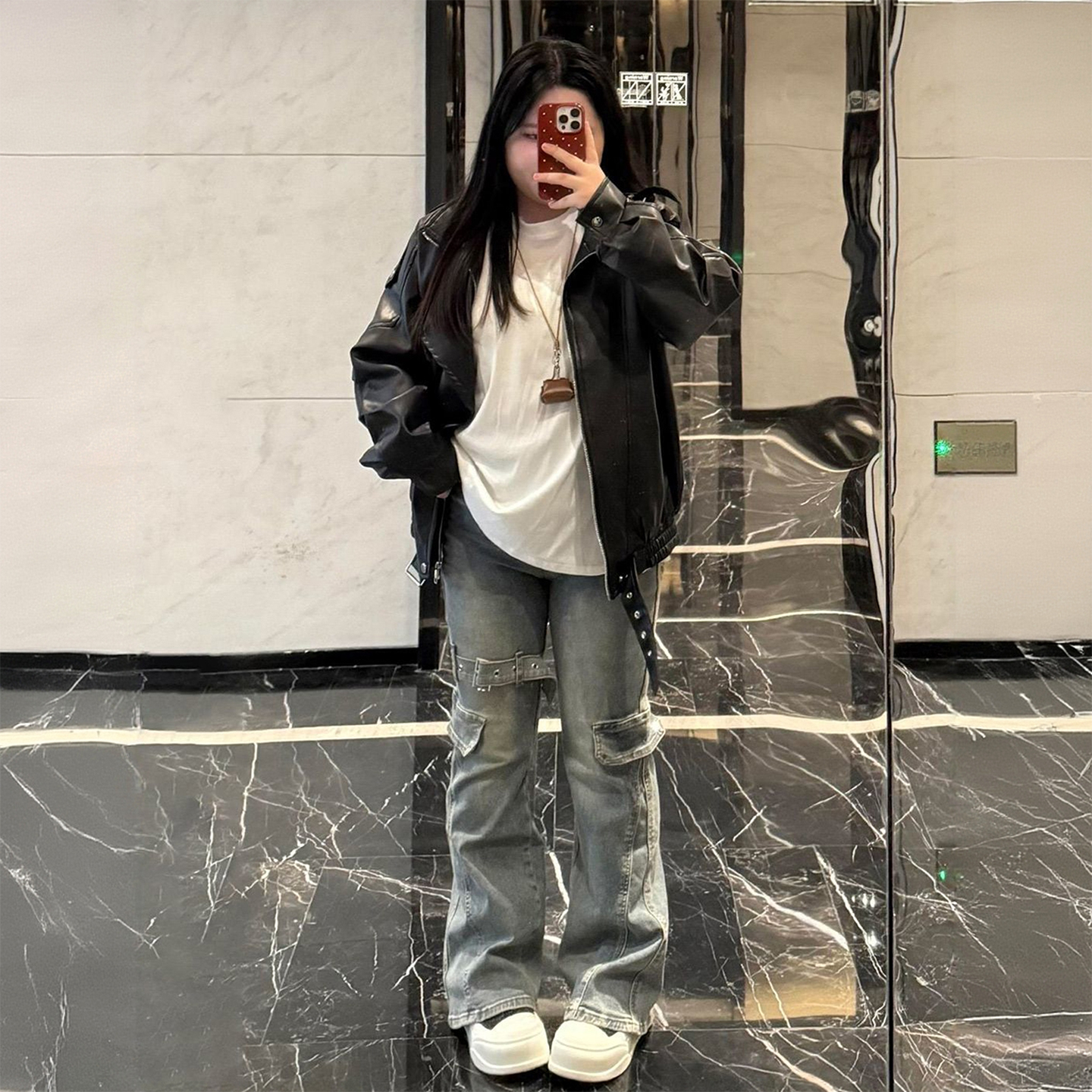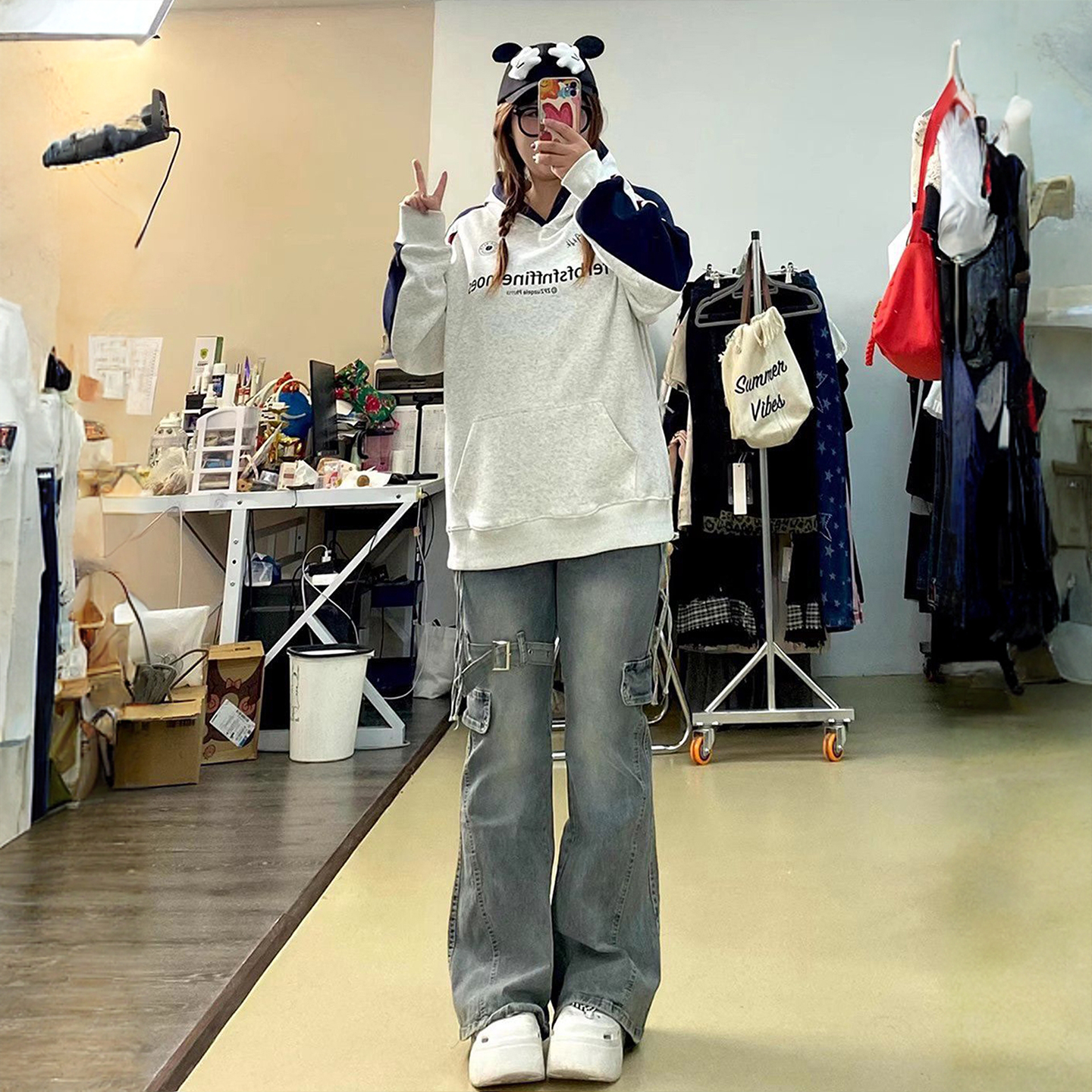 大码美式复古拼接毛绒微喇工装牛仔裤女秋冬新款辣妹修身显瘦长裤