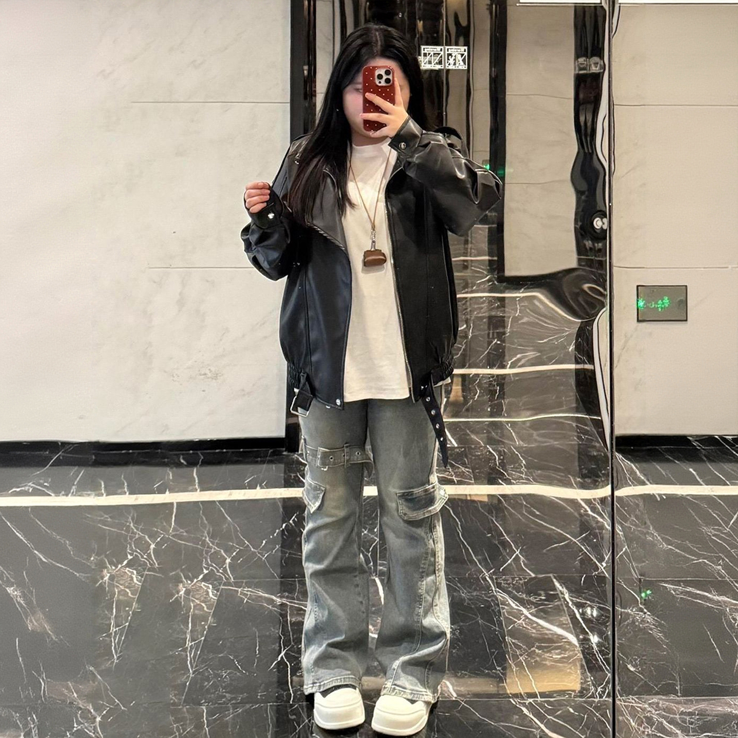 饭饭又饿了复古水洗工装牛仔裤女秋季款垂感阔腿百搭直筒显瘦裤子