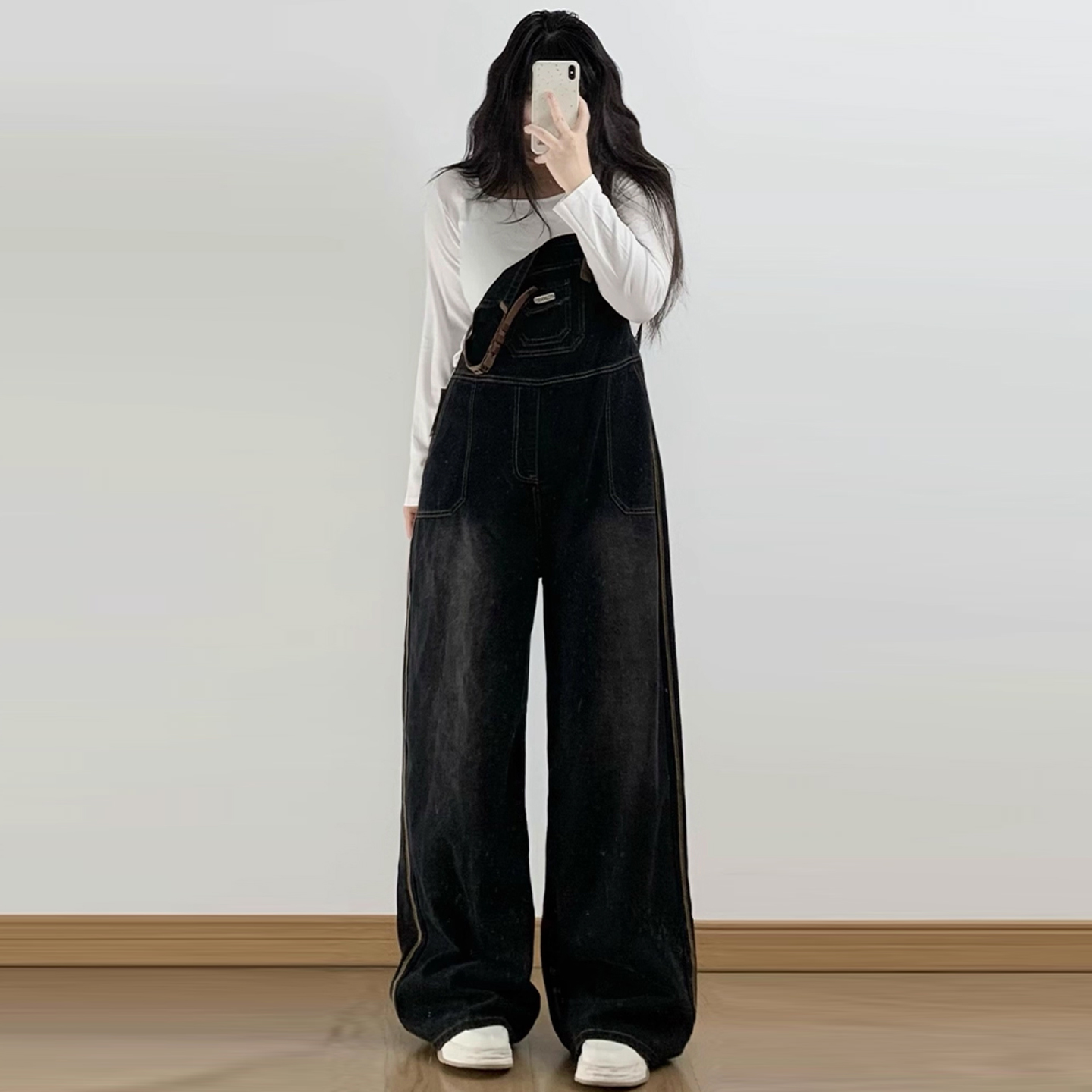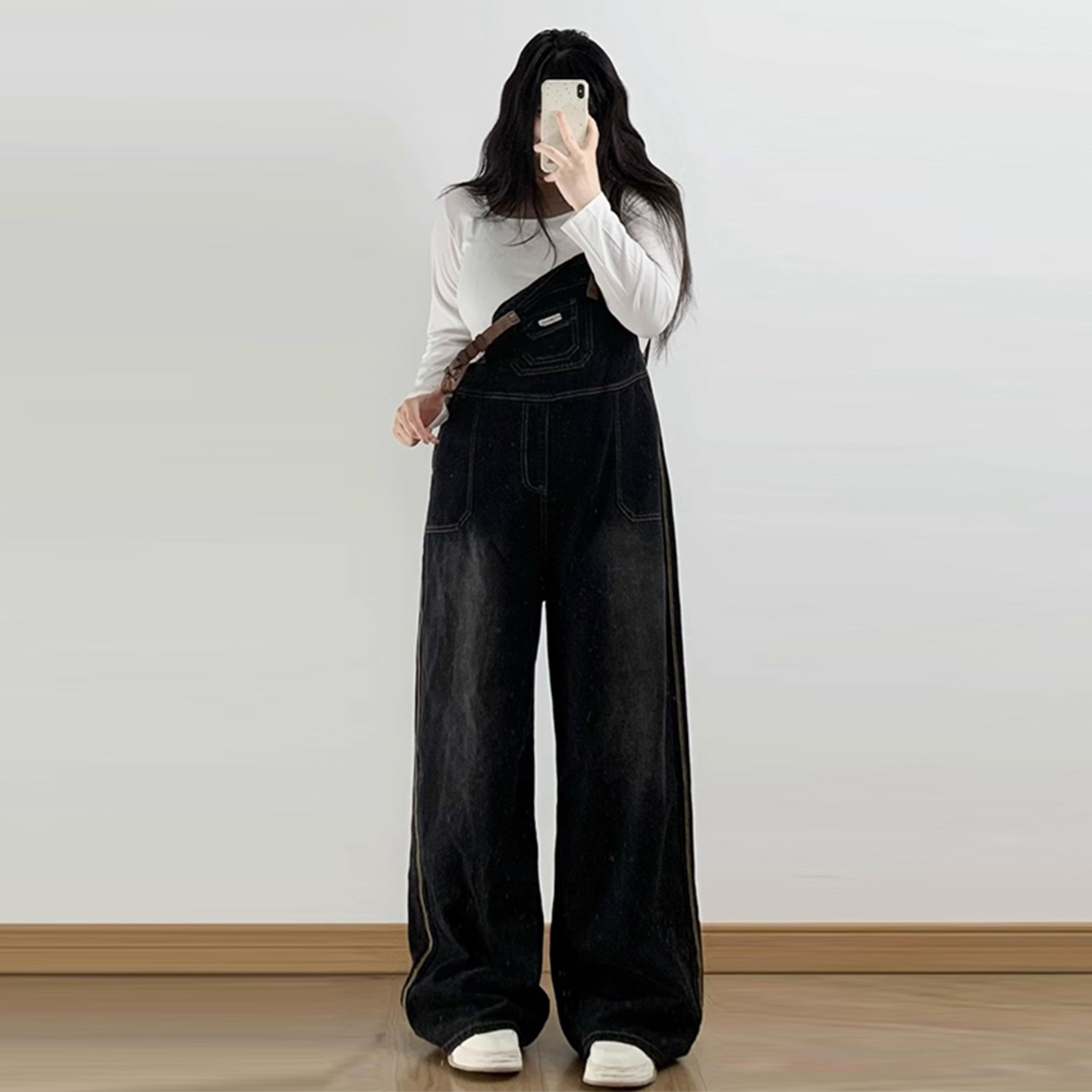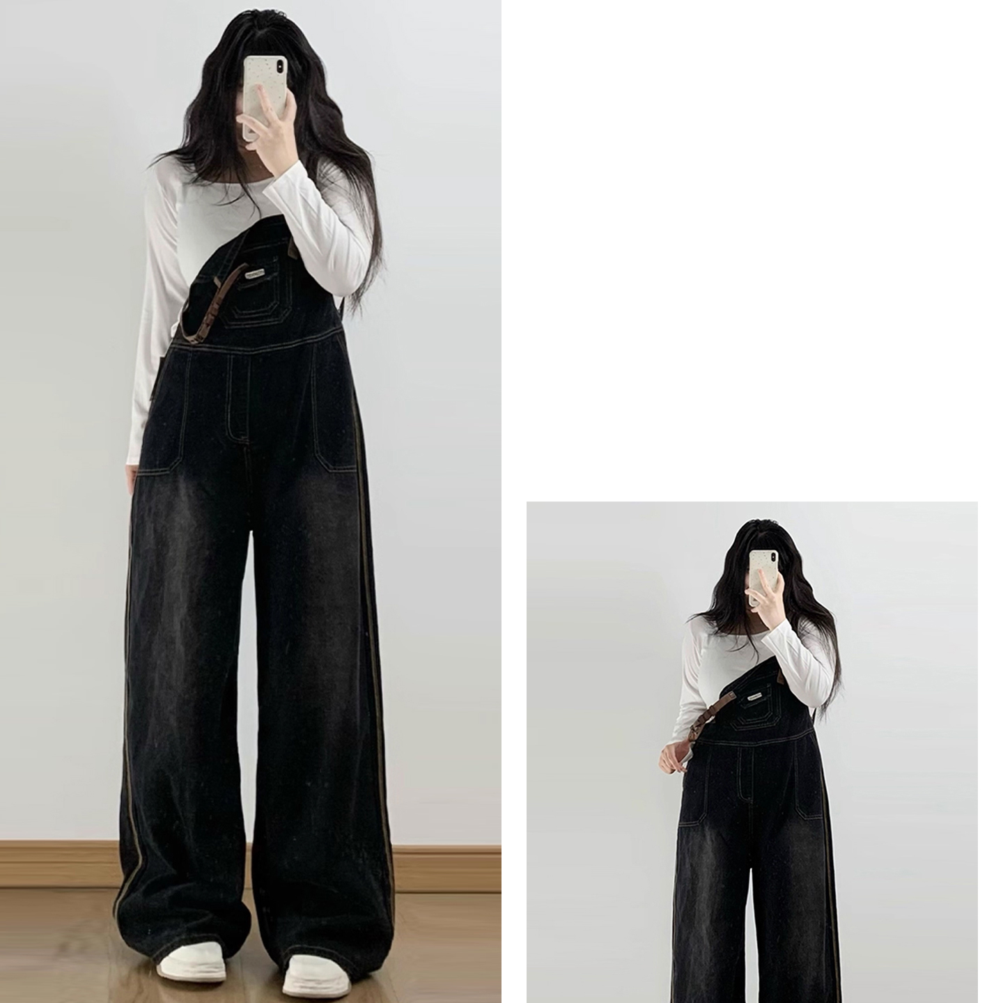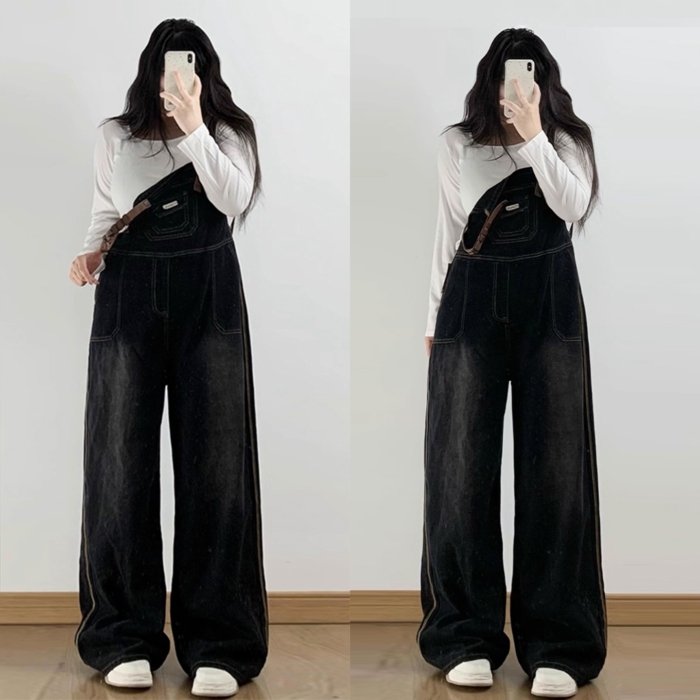 淘宝300斤特大码女装黑色牛仔背带裤女设计感小众美式工装连体长裤子