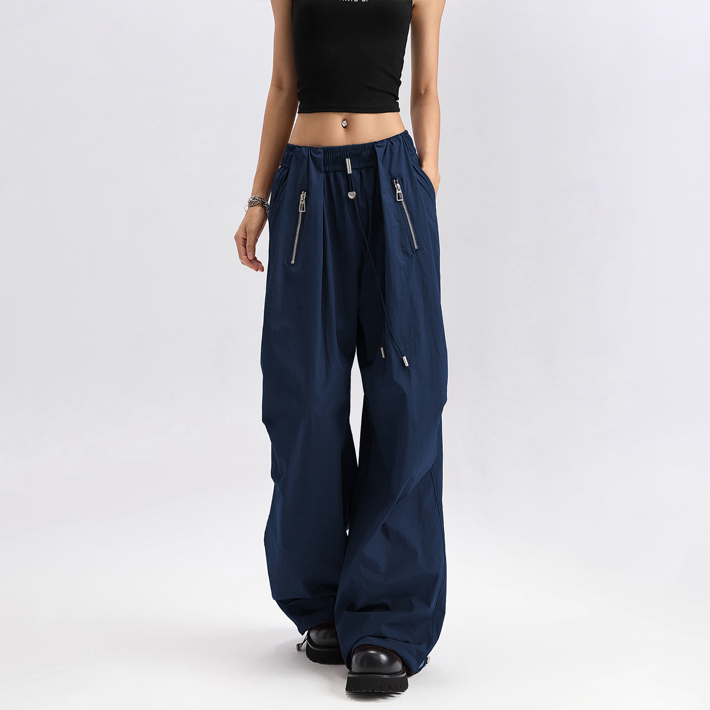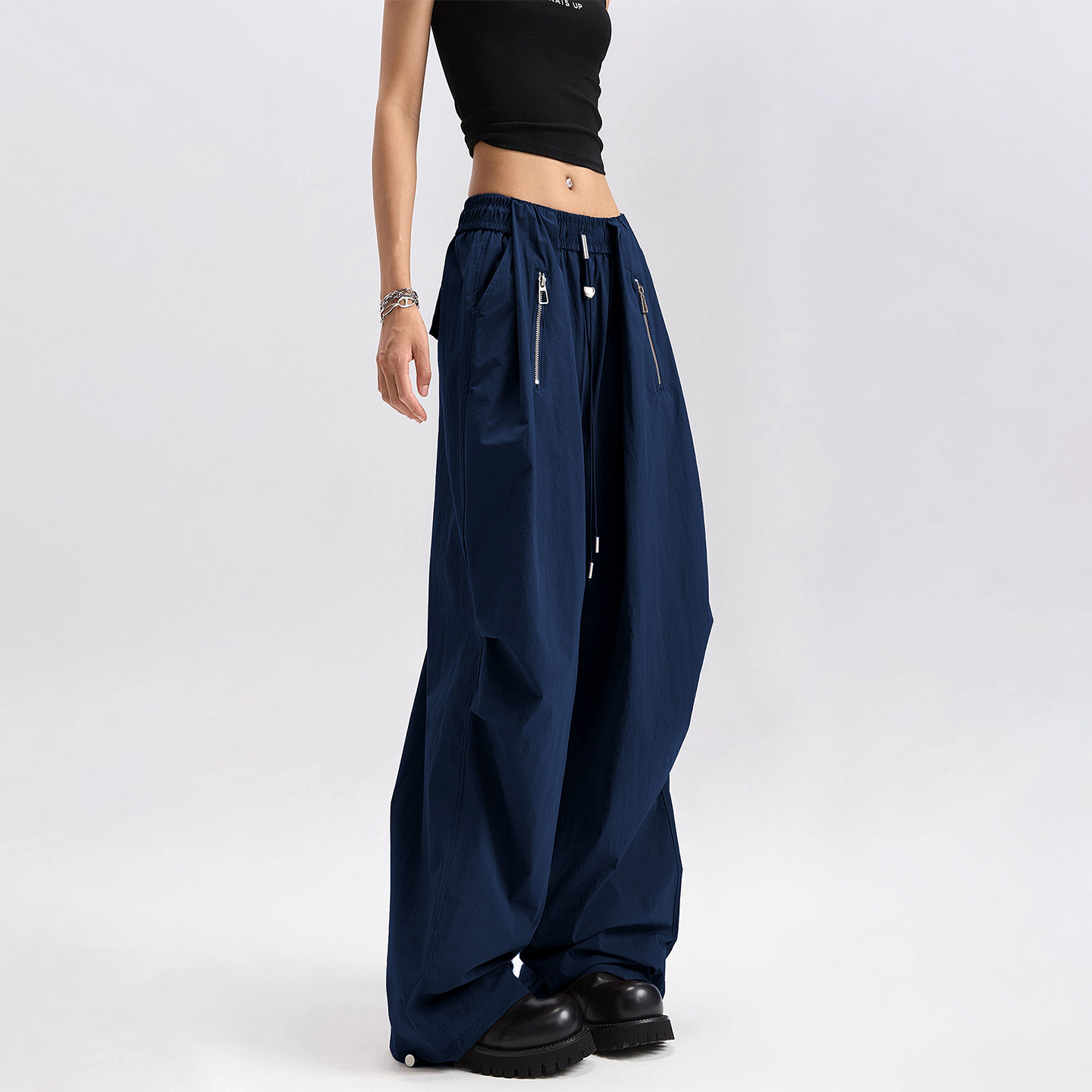 2025年秋季爆款来袭!这款高个子专属超长藏青色美式阔腿工装裤,专为追求舒适与时尚的女性设计。采用优质垂感面料,宽松阔腿版型搭配加长拖地设计,轻松拉长腿部线条,尽显高挑气质。经典藏青色百搭耐看,融合美式工装元素——多口袋装饰、金属扣细节,兼具实用性与潮流感。高腰剪裁提升腰线,包容各种身材,无论是搭配短款上衣还是针织衫,都能穿出随性 chic 风格。适合通勤、街拍或休闲出行,是今秋不可或缺的时尚单品,高个子女生的衣橱必备!