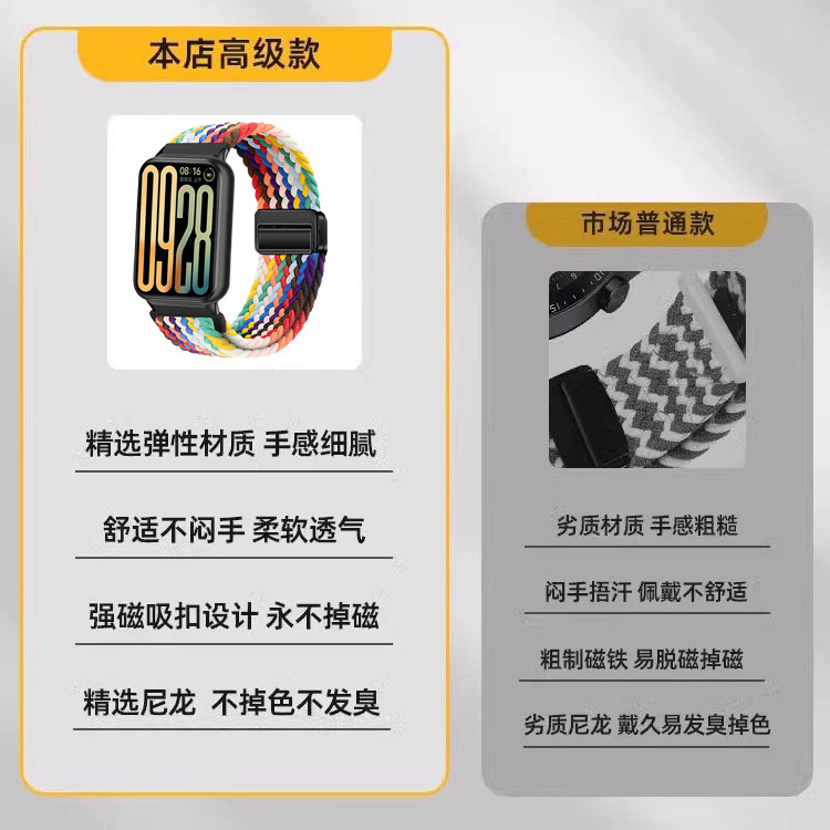 小米手环9 Pro表带及Redmi Watch 5/4/6/5尼龙编织磁吸扣腕带,专为追求舒适与时尚的用户设计。采用高品质尼龙编织材质,轻盈透气,佩戴亲肤不闷热,适合全天候运动与日常使用。创新磁吸扣设计,稳固贴合且调节便捷,一按即扣,轻松应对不同手腕尺寸。简约高级的配色搭配流畅线条,彰显现代科技美感,男女皆宜。兼容多款小米及Redmi智能穿戴设备,是8 Pro等机型理想的替换表带选择。无论是健身、通勤还是休闲场合,都能提升佩戴体验,兼顾功能性与高颜值,是智能生活的不二之选。