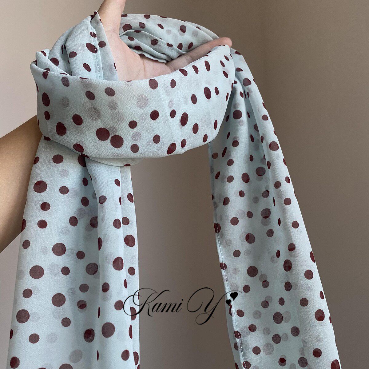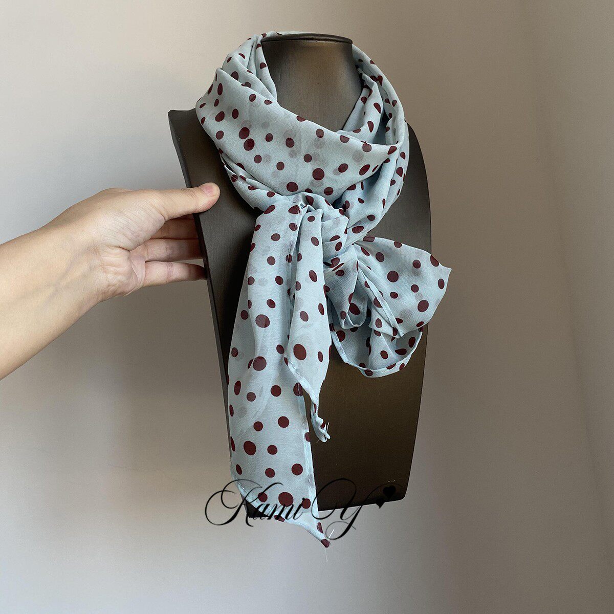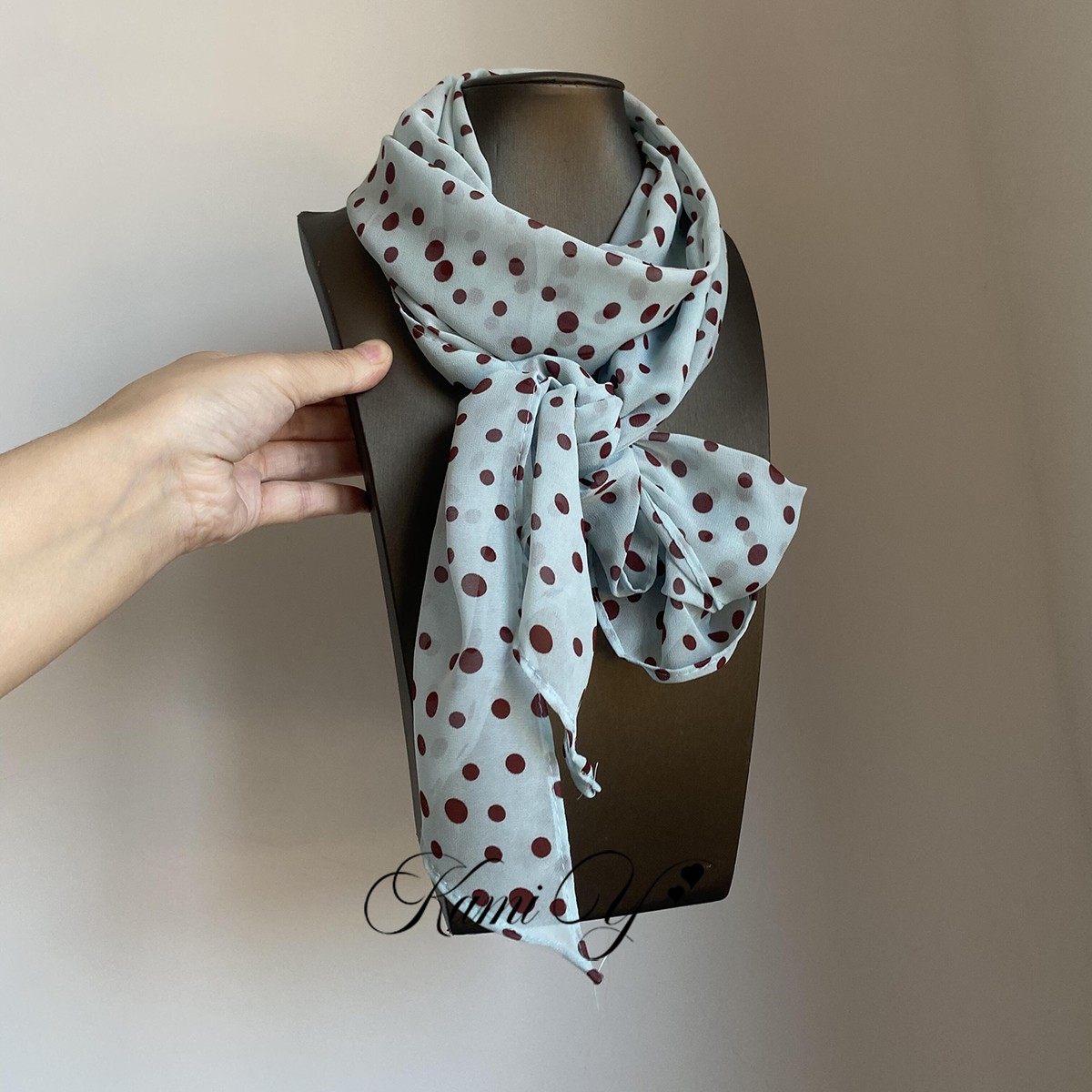 2025春夏新款雾霾蓝法式波点印花丝巾,以低饱和度的雾霾蓝为基调,点缀经典黑白波点,优雅中透出慵懒法式风情。精选轻盈柔滑的真丝或仿丝材质,触感细腻,垂坠感佳,兼具透气性与光泽感。一巾多用,可系于颈间作长围巾,亦可作为发带、腰带或包包点缀,轻松打造随性 chic 造型。无论是搭配简约白衬衫、针织开衫,还是连衣裙,都能为整体穿搭增添一抹浪漫艺术气息。是都市女性日常通勤、度假出行的理想配饰,尽显低调高级的时尚品味。