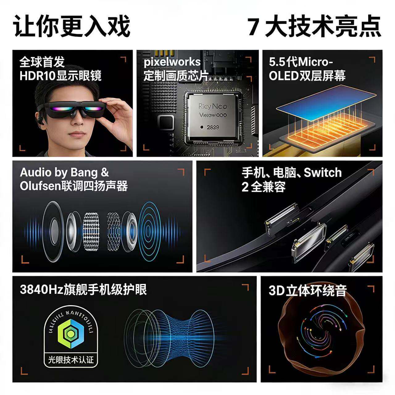 雷鸟Air 4 Pro智能AR眼镜头戴电视,是首款支持HDR10标准的智能AR眼镜,带来影院级高清观影体验。搭载Micro-OLED显示屏,单眼分辨率高达1920×1080,色彩饱满、对比度高,真实还原HDR10动态细节。采用BirdBath光学方案,提供等效140英寸巨幕效果,支持6米虚拟视距,沉浸感媲美私人影院。设备轻巧便携,支持手机、平板、电脑多设备无线连接,兼容主流视频平台。内置双扬声器与智能瞳距调节,兼顾音效与佩戴舒适度。作为XR设备新标杆,雷鸟Air 4 Pro融合高清显示、AR交互与移动便携,重新定义随时随地的高品质视听体验。