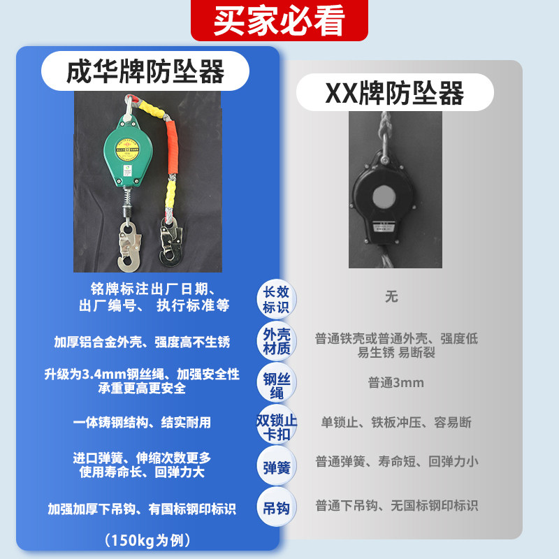 成华防坠器高空速差自锁器专为塔吊、货梯等高空作业设备设计,具备可靠的防坠落保护功能。产品采用高强度合金材质,承重达1吨至2吨,适用于5米、10米、20米、30米、50米及60米等多种作业高度,满足不同施工场景需求。其核心速差自锁技术可在人员失足瞬间自动锁止,有效防止高空坠落事故,保障作业人员安全。结构紧凑、安装便捷,广泛应用于建筑工地、电力安装、桥梁施工等领域。成华防坠器通过国家相关安全认证,耐腐蚀、抗冲击,经久耐用,是高空作业安全防护的重要装备,为重型设备操作提供坚实保障。