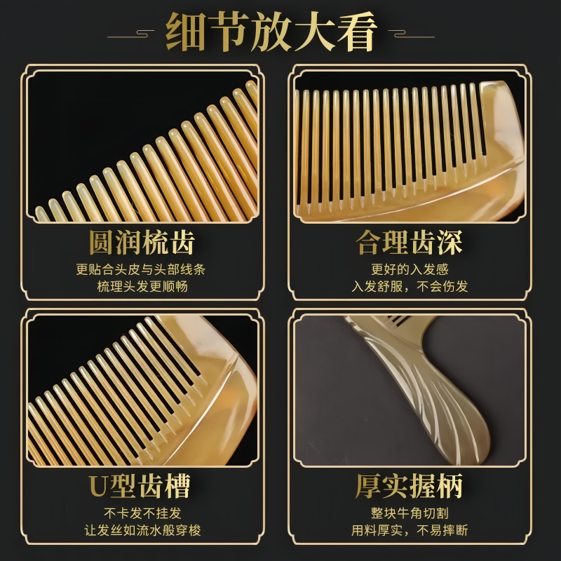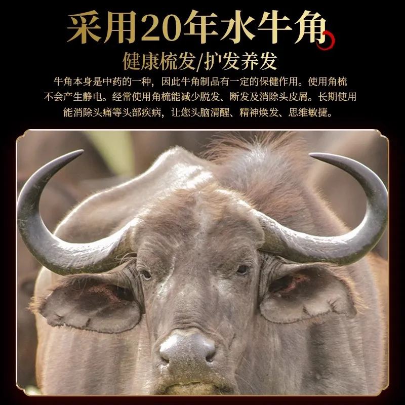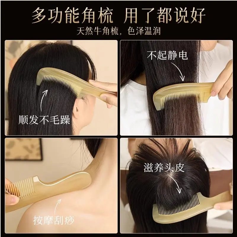 天然正品牛角梳,精选优质天然牛角精工打磨而成,质地坚韧,光泽温润。加厚设计更耐用,适合日常家用。适用于男士女士,尤其适合长发人群,梳齿圆润光滑,不伤头皮,有效减少断发打结。独特牛角材质天然防静电,秋冬使用亦无恼人静电困扰。同时,牛角梳兼具按摩功效,梳头时可刺激头部经络穴位,促进血液循环,缓解疲劳,养护秀发。无毒环保,手感舒适,是呵护头发与健康的生活佳品。长期使用,有助于改善头皮环境,令秀发更柔顺亮泽。天然牛角梳,既是实用梳具,也是养生之选。