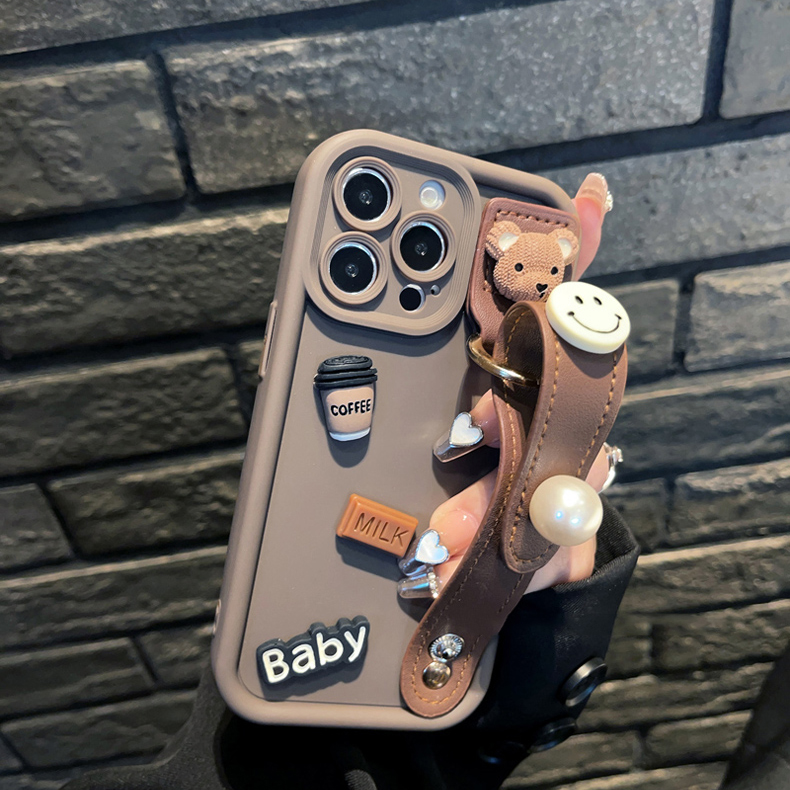 天猫可爱咖啡小熊腕带适用苹果15手机壳华为mate60pro新款OPPOReno12女高级vivos19趣味小米14全包pura70保护套爆